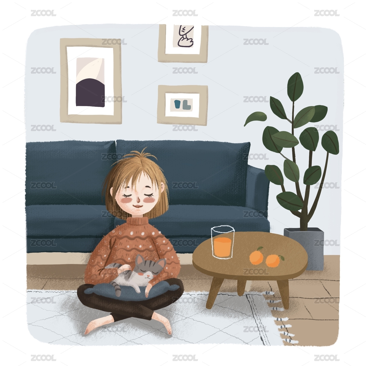 一个小姑娘宅在家里的沙发前撸猫和果汁