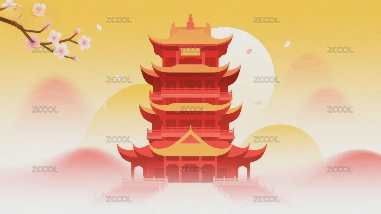 国潮武汉地标建筑黄鹤楼春天樱花林插画