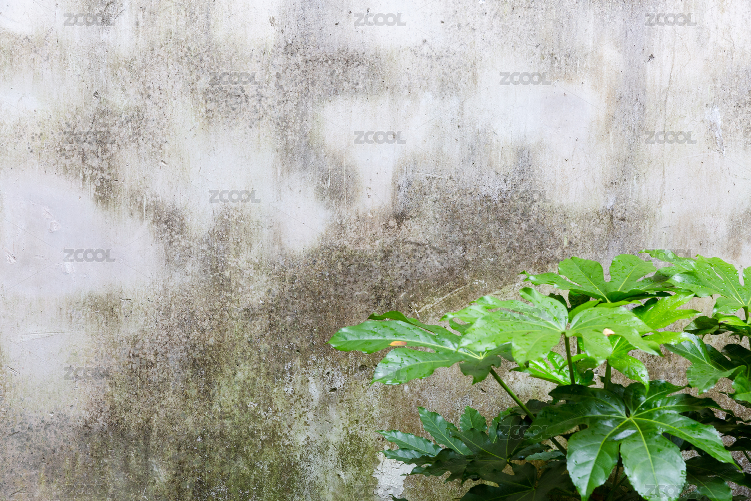 斑驳的水泥墙上伸出的一绿色枝葡萄藤