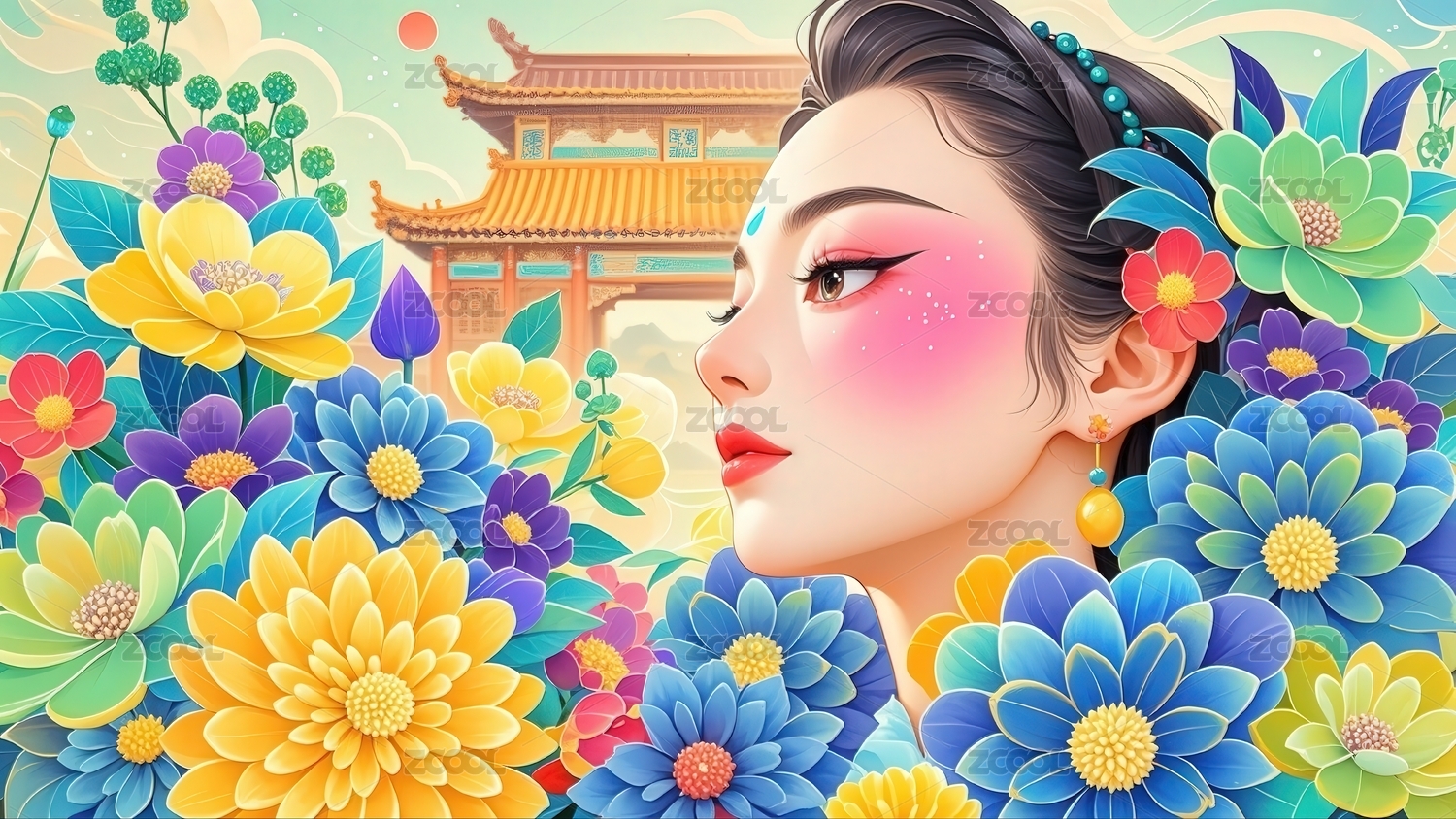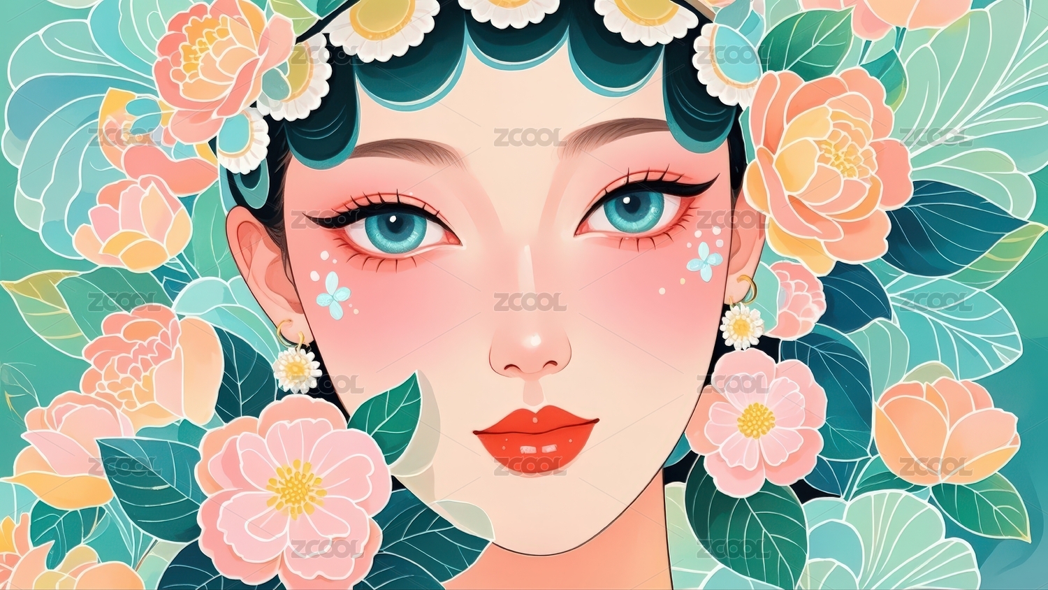 粉色, 花朵, 服装, 头饰, 唯美, 艺术, 温柔, 女孩,插画, 水彩