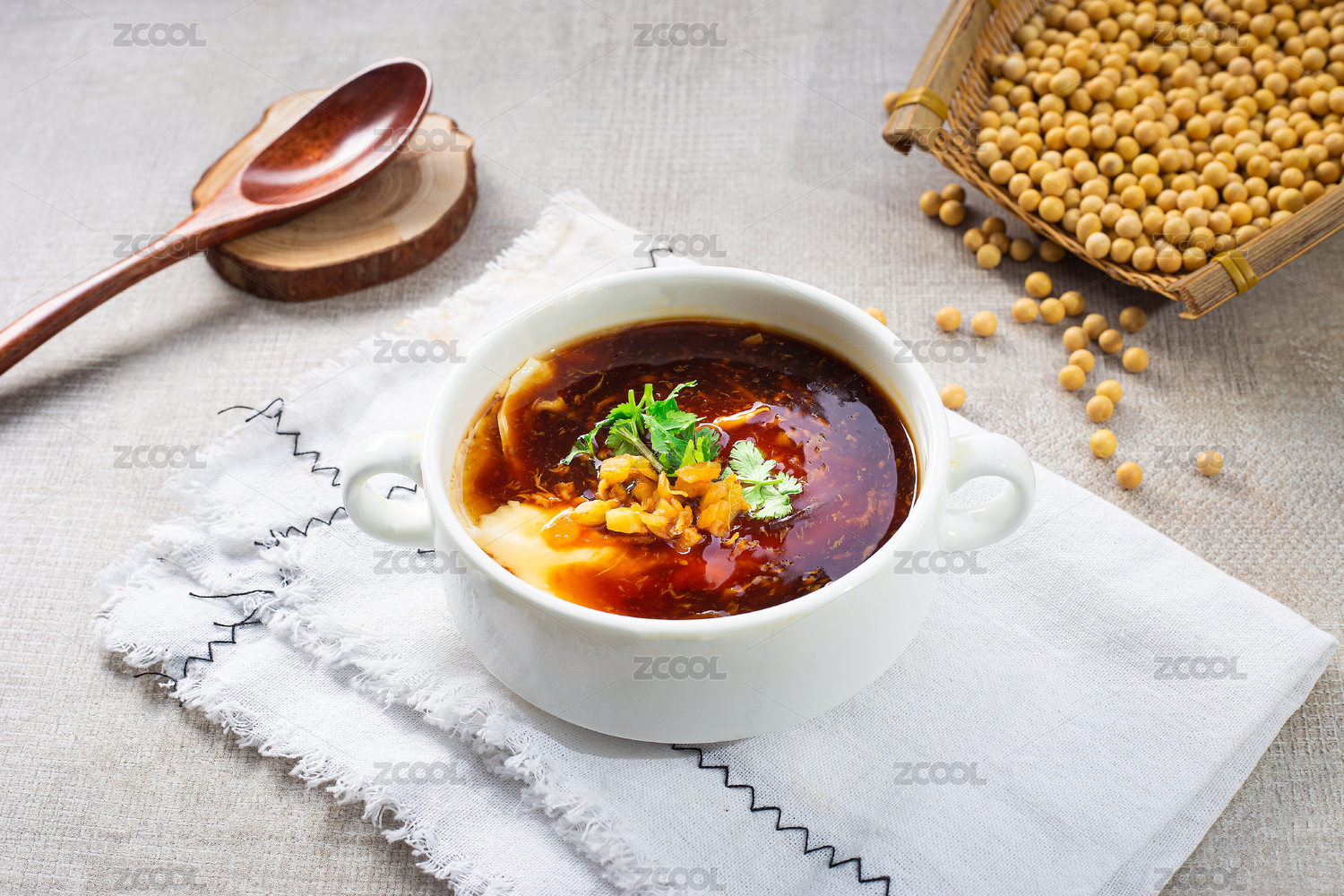 传统早餐豆腐脑特写古窗棂木桌面背景
