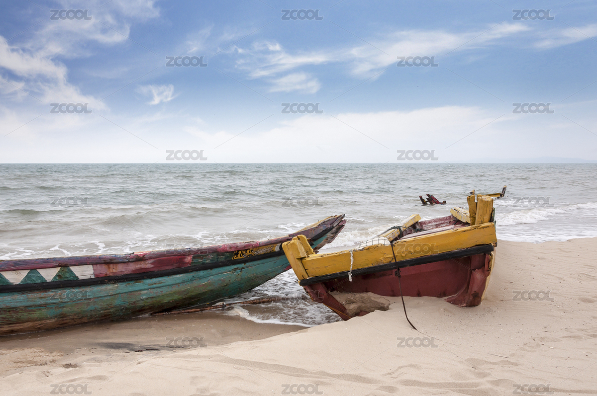 空旷的沙滩和废弃的木质渔船