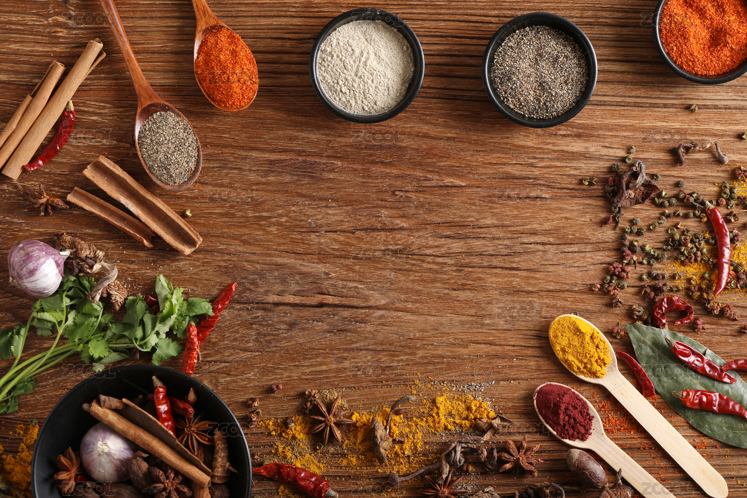 正上方视角黑色背景木勺里装着各种调味料
