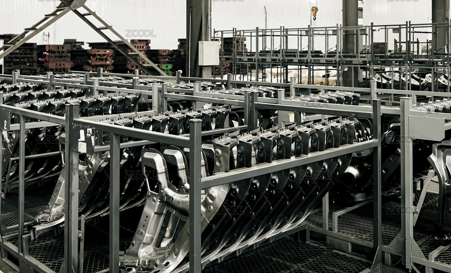 堆放在仓库内的钢铁模型