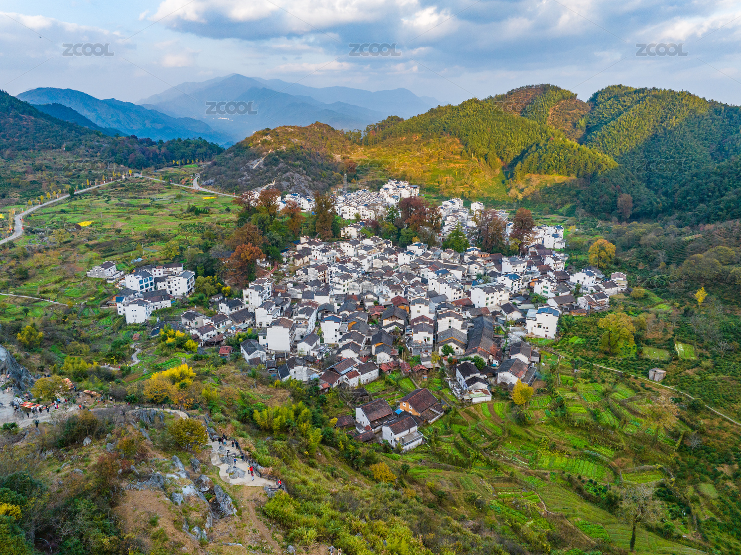 航拍江西婺源石城徽派建筑秋色枫叶村庄日出