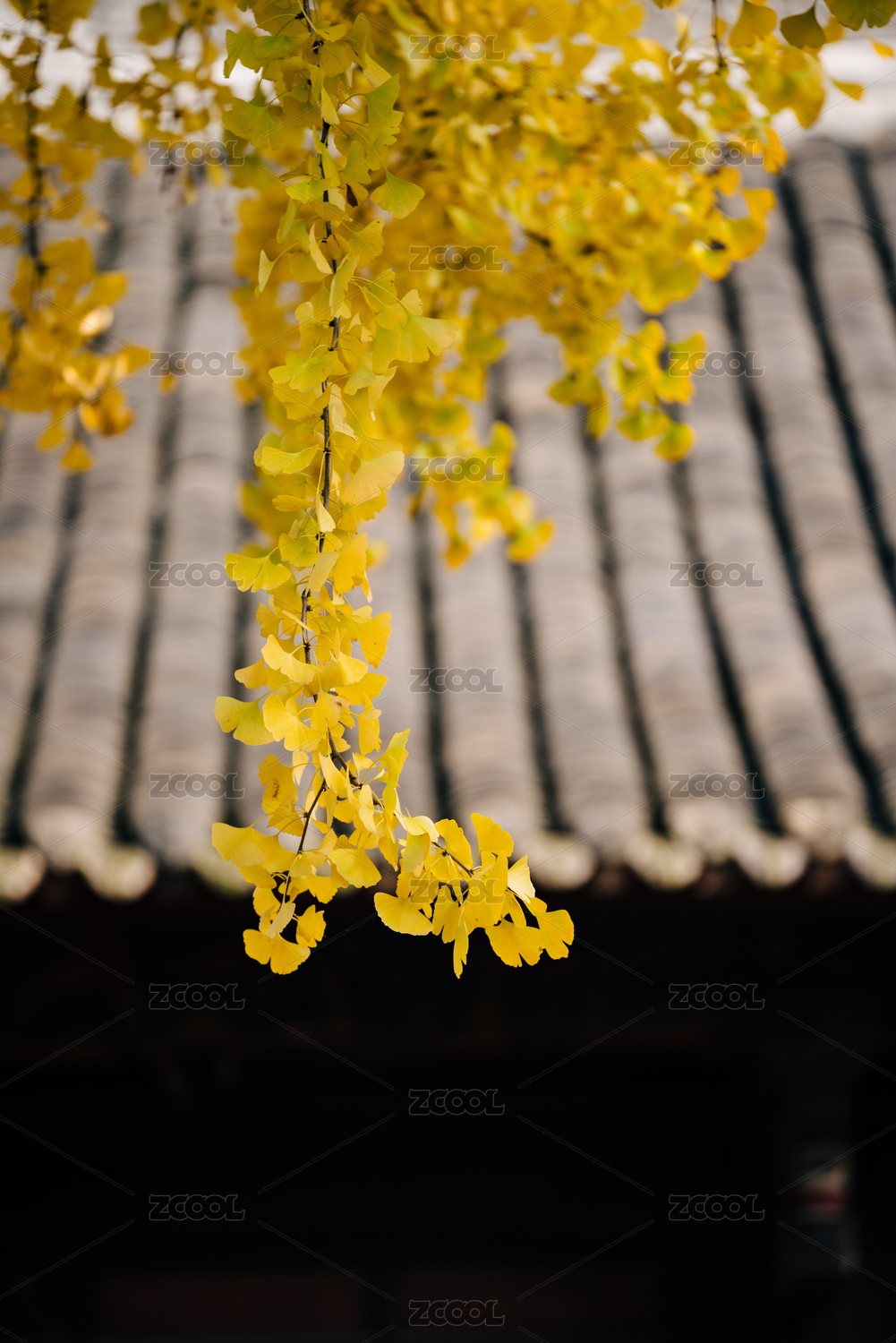 北京圆明园秋日古建筑屋檐与金黄银杏叶