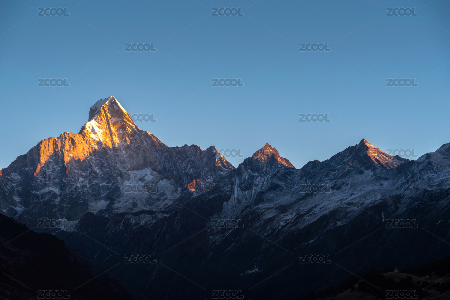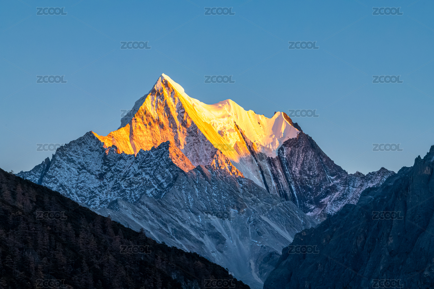 晴朗天空下的稻城亚丁日照金山时刻