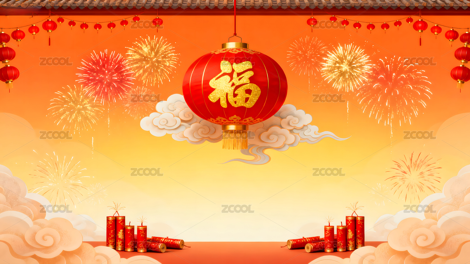 带有灯笼烟花梅花福字图案的春节喜庆海报
