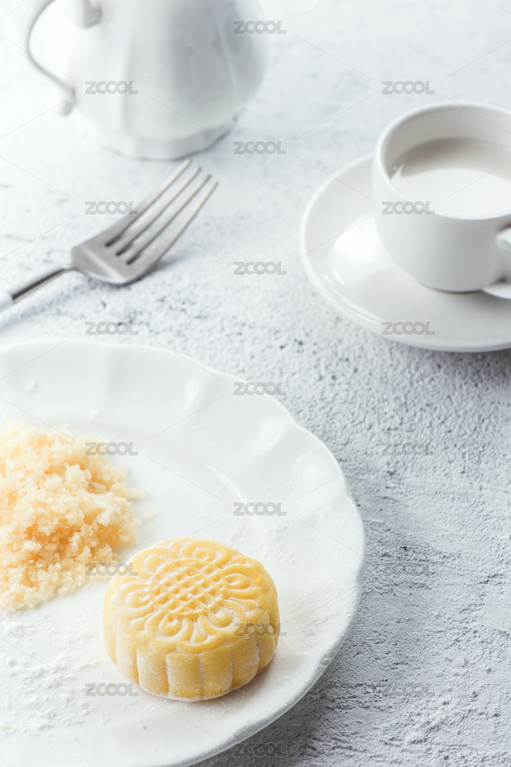 一盘黄色椰蓉陷料冰皮月饼放置在水泥质感的桌面上