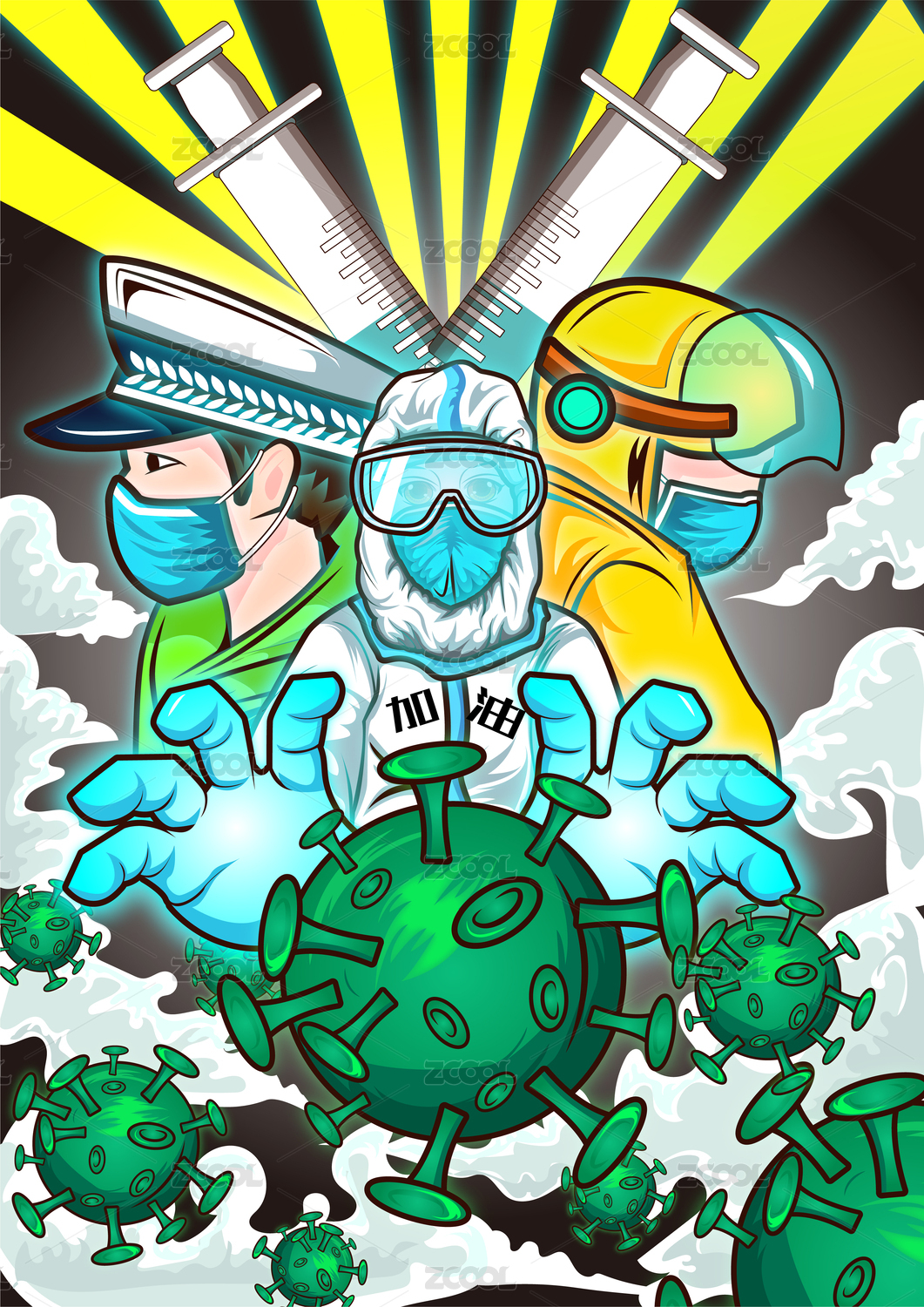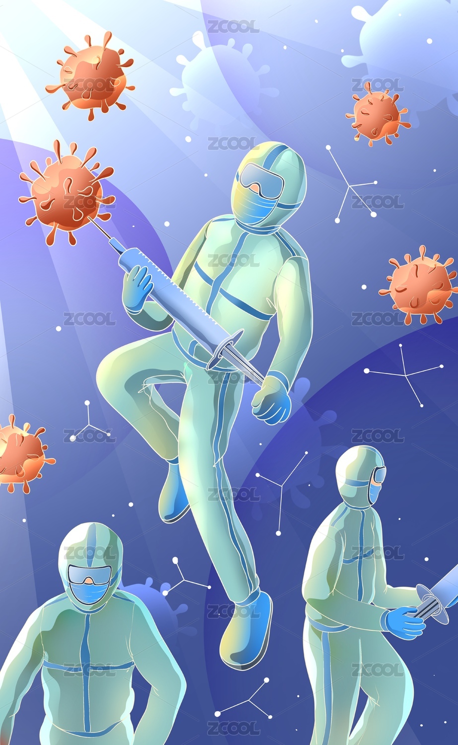 防疫人员身穿防护服用疫苗和消杀抗击新冠