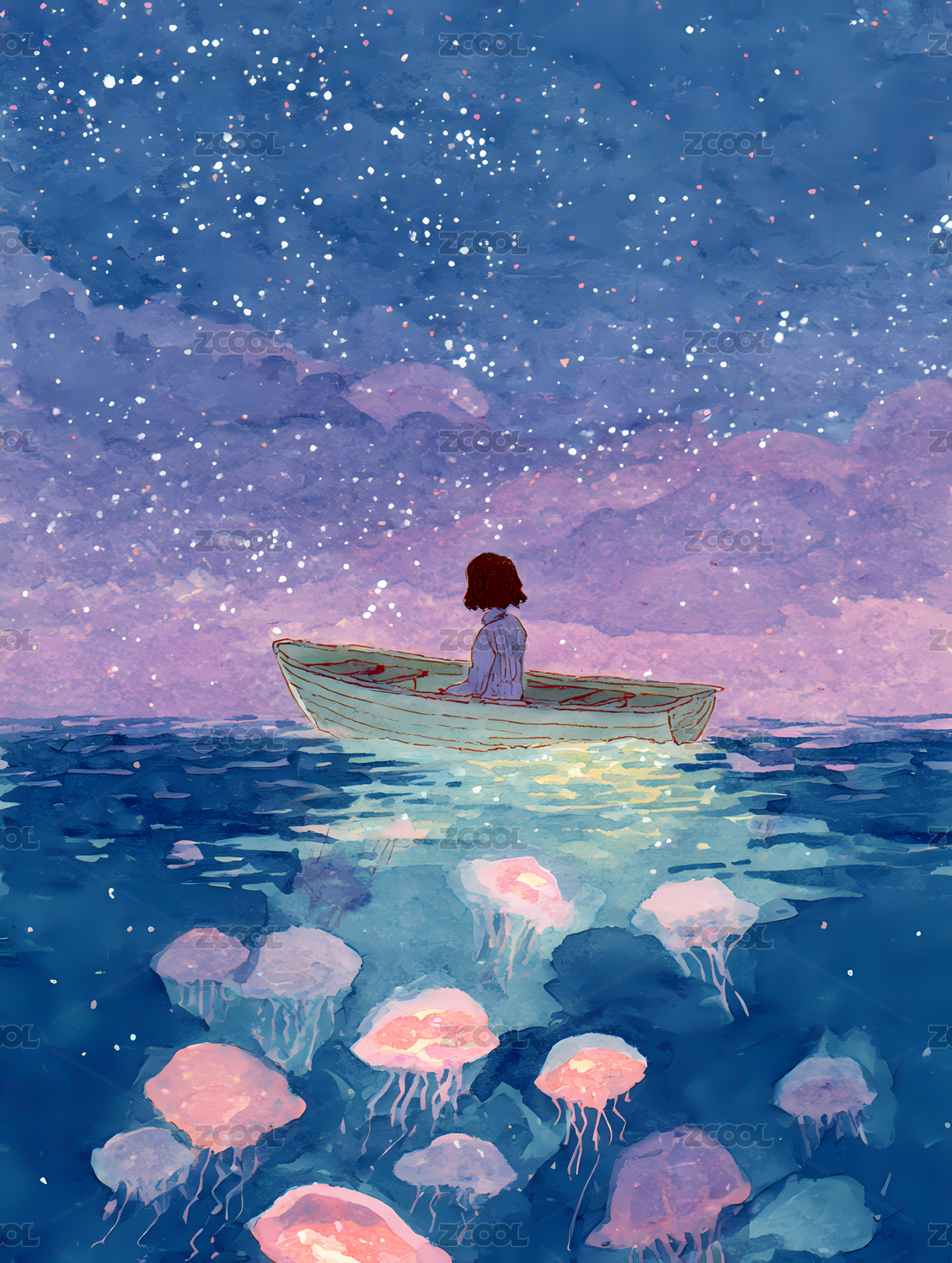 夜晚大海上有一只水母形状的船被女孩拉着走