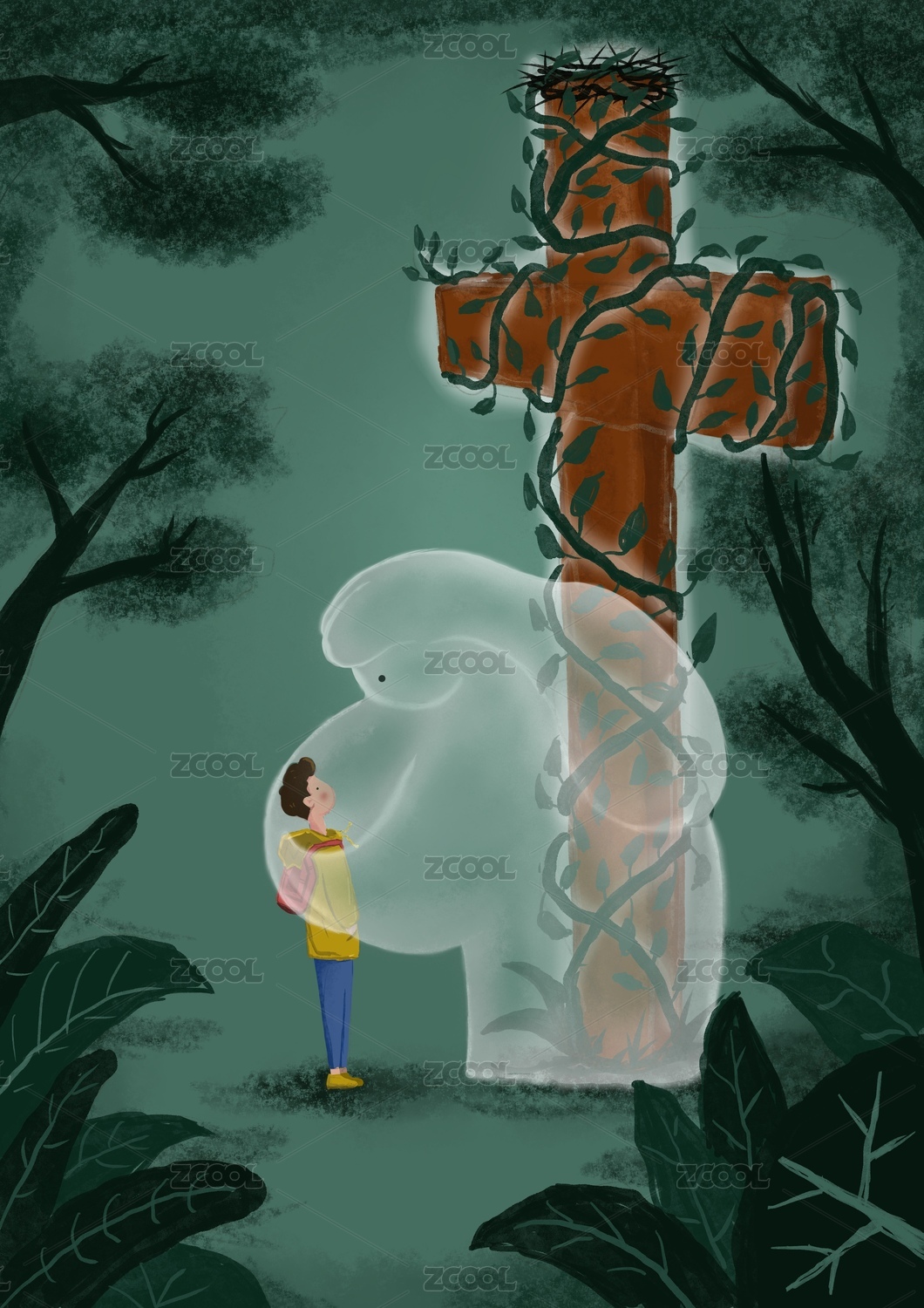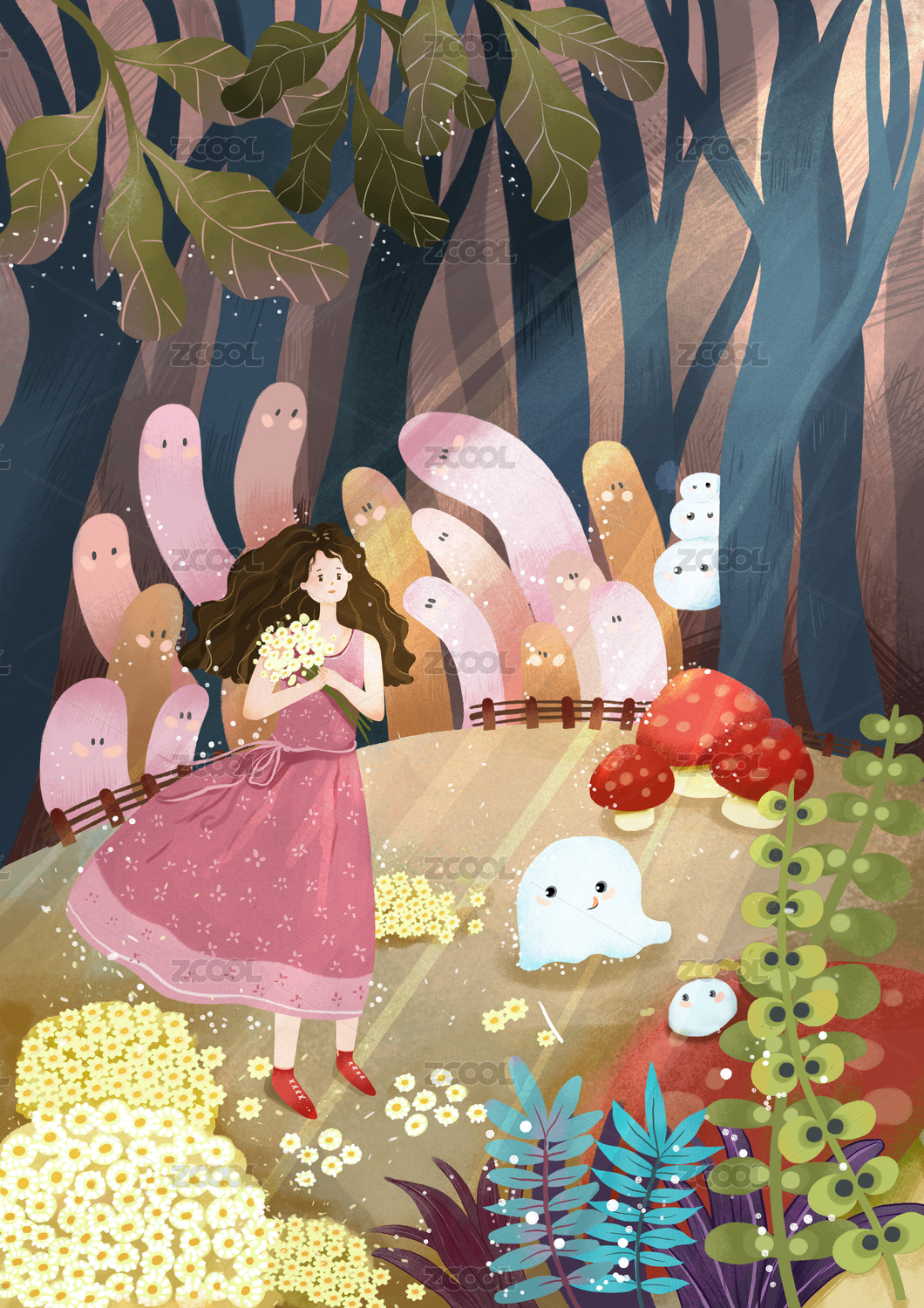 野外,户外,玩偶,人物,游玩,扁平,插画,树林,绘本风,森林