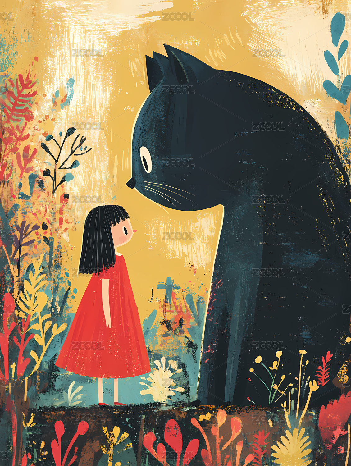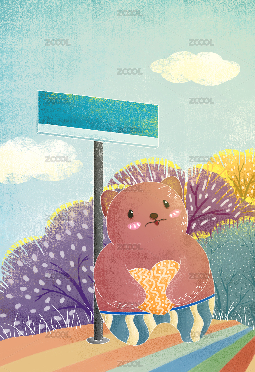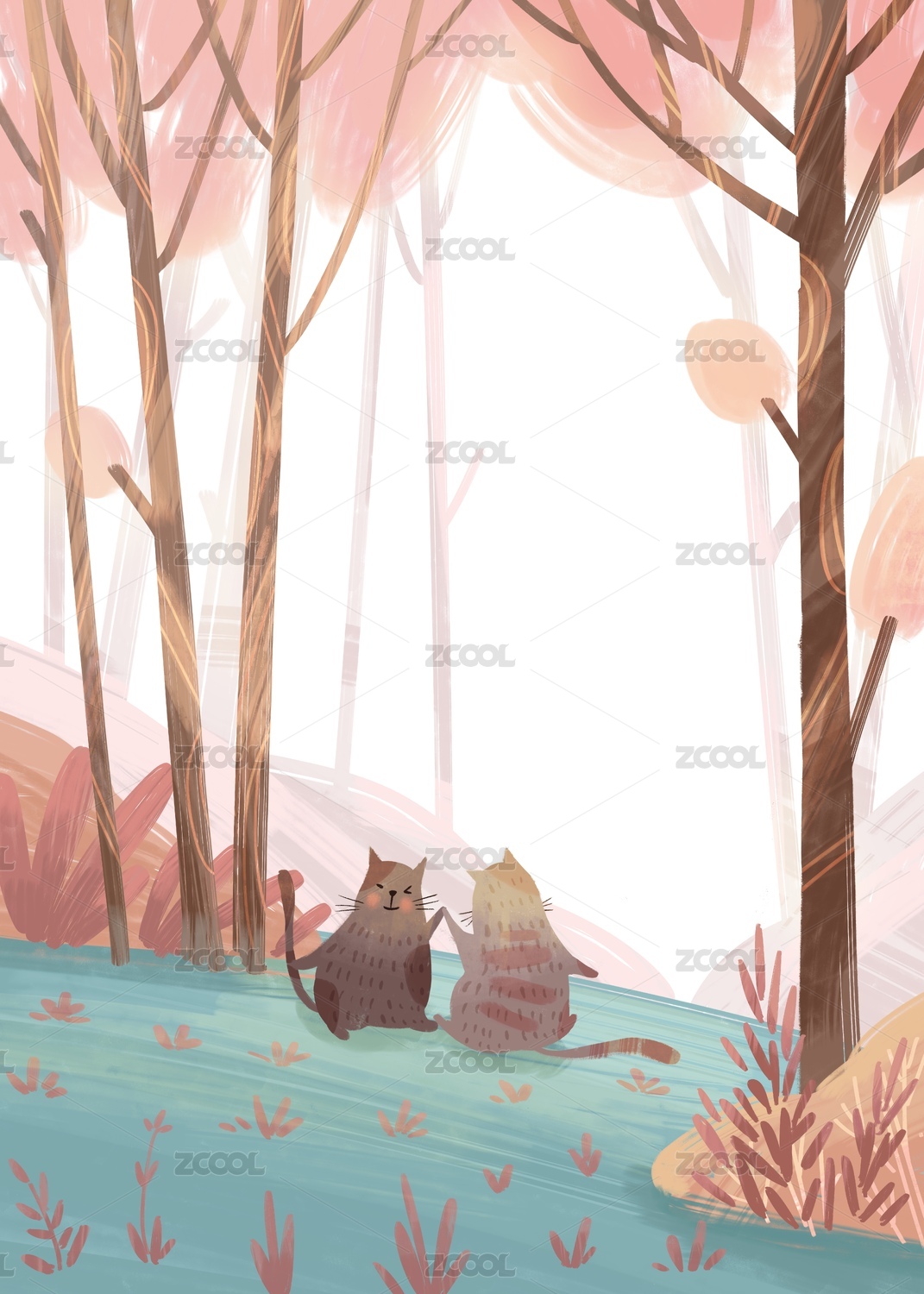 儿童插画自然风光森林灌木可爱猫咪玩耍拍手