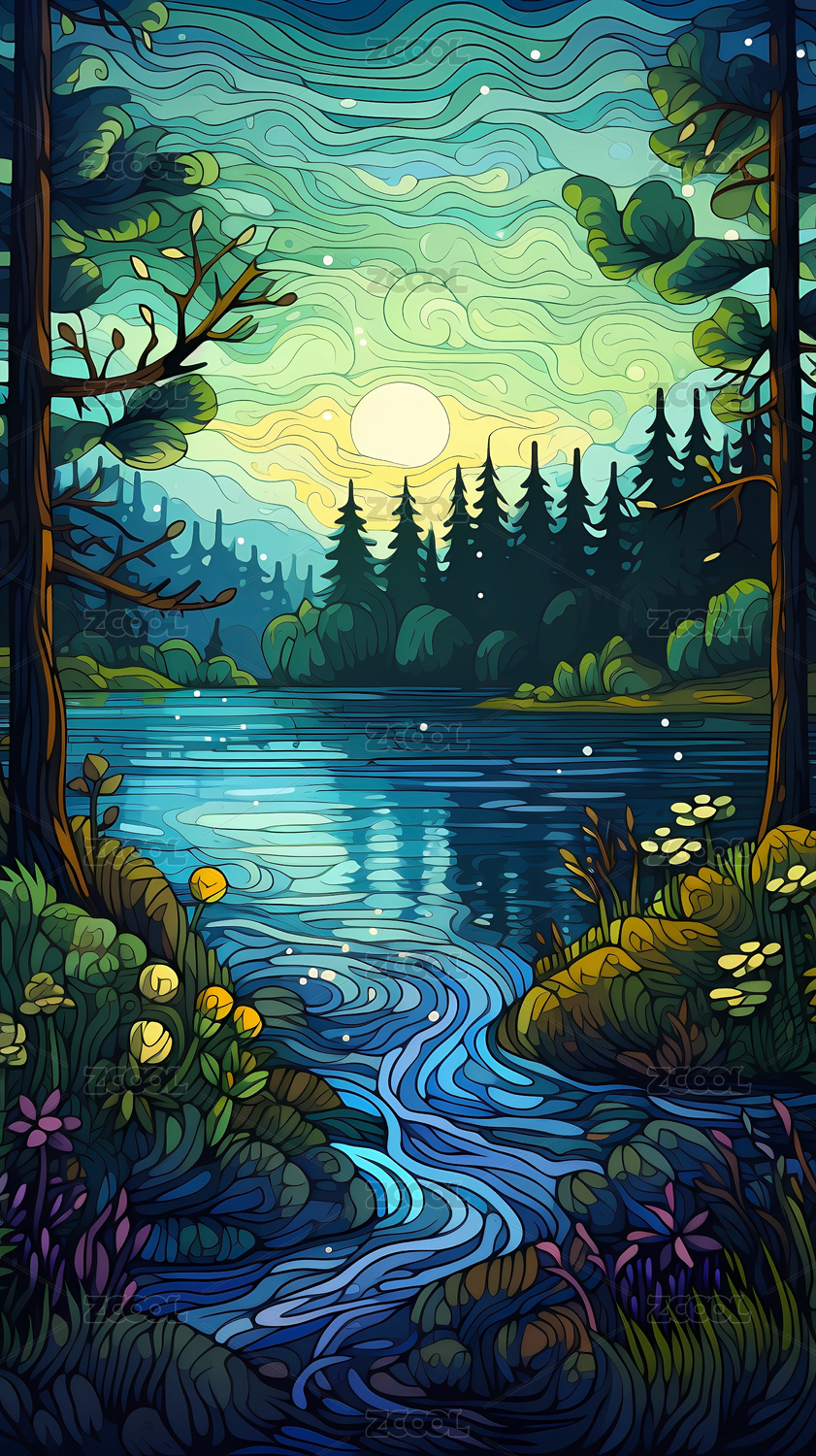 手绘,卡通,唯美,印象派,夏天,风景,天空,户外,水面,油画