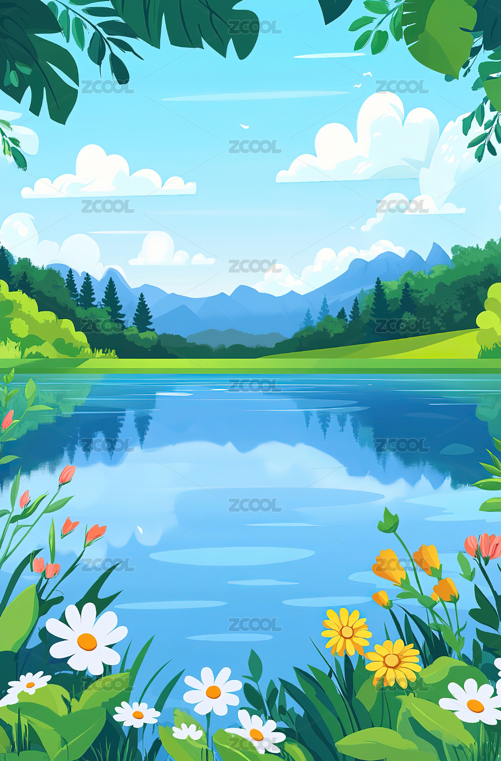 手绘卡通蓝色天空下的森林湖泊风景插画