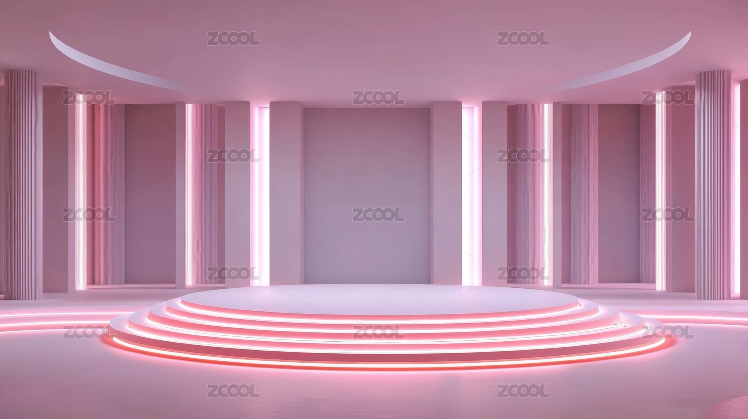 三维渲染蓝紫色霓虹灯拱门室内空间