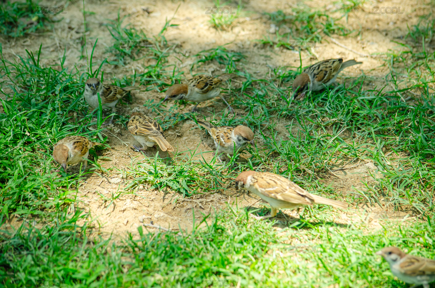 地上觅食的一群麻雀