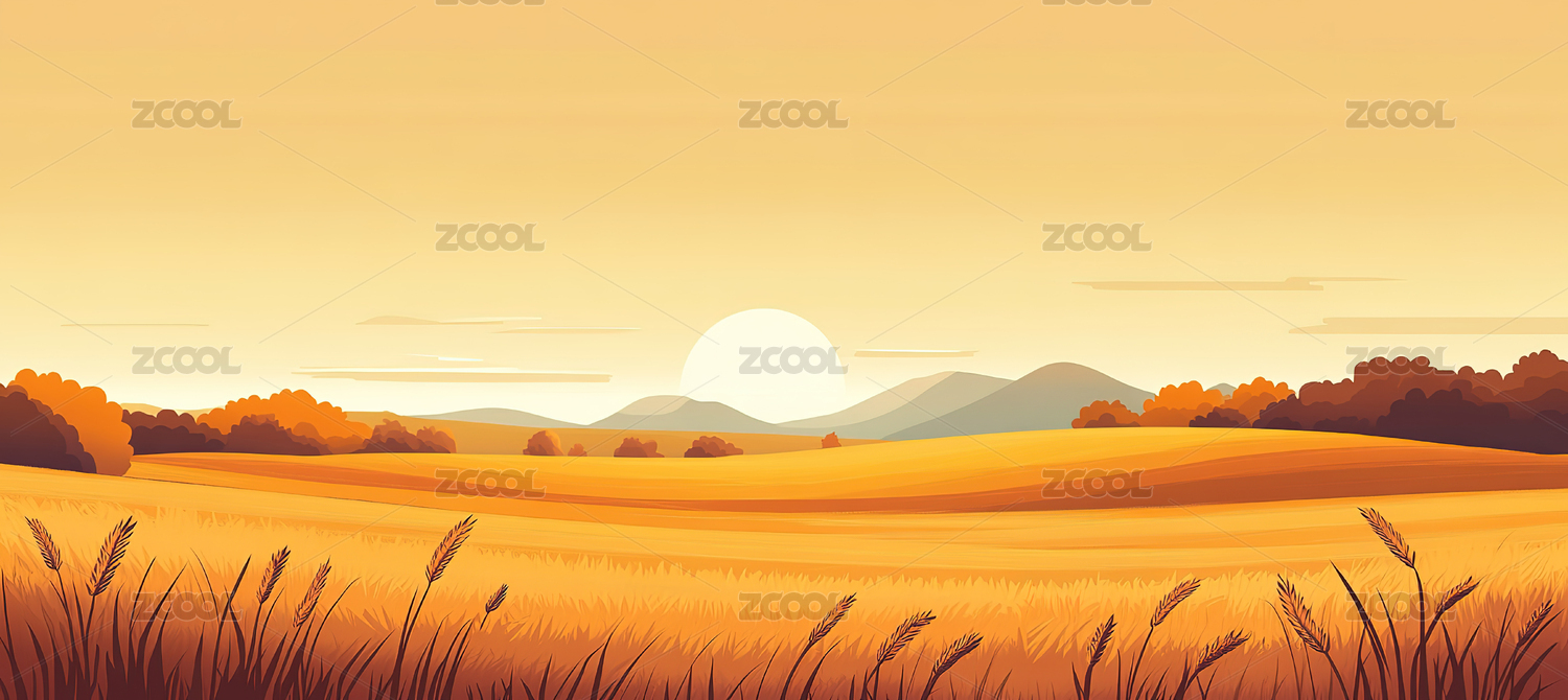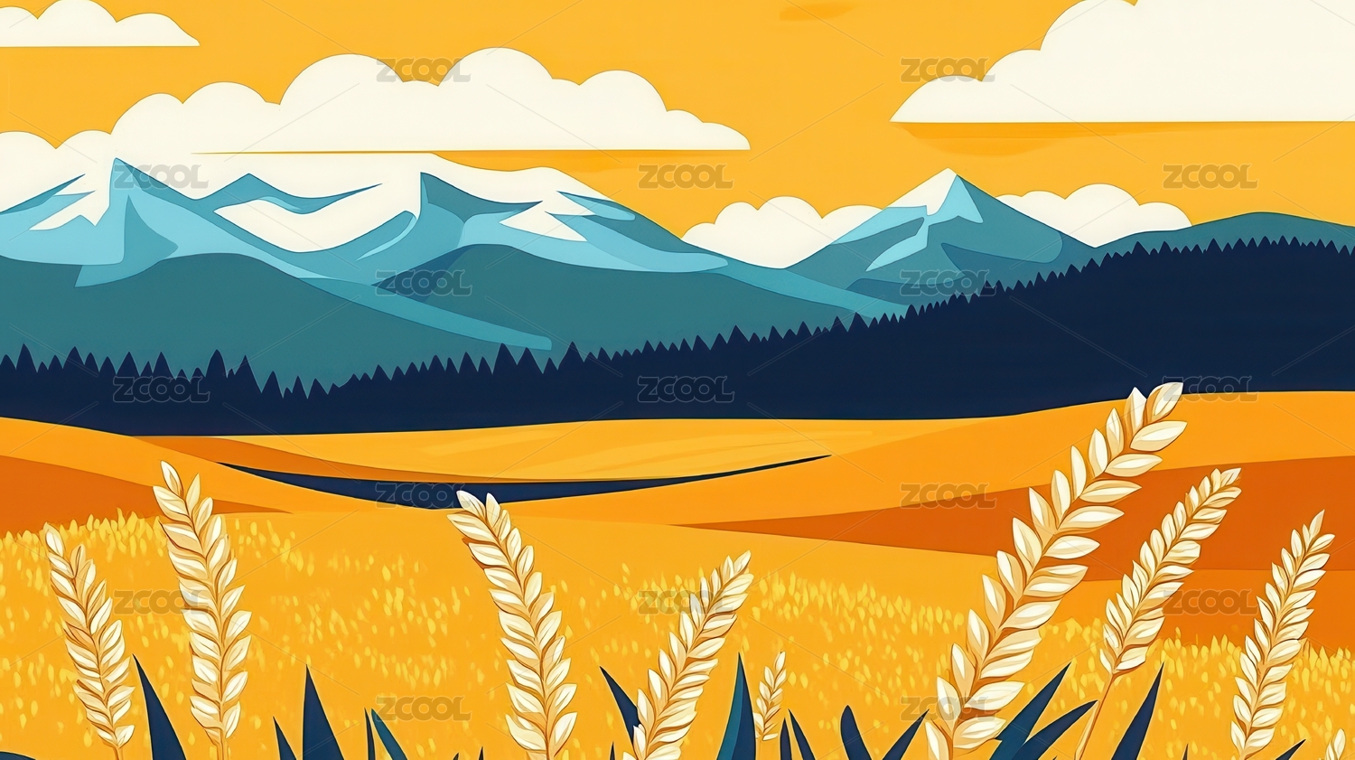 唯美金黄色麦田蓝天白云清新景色节气背景插