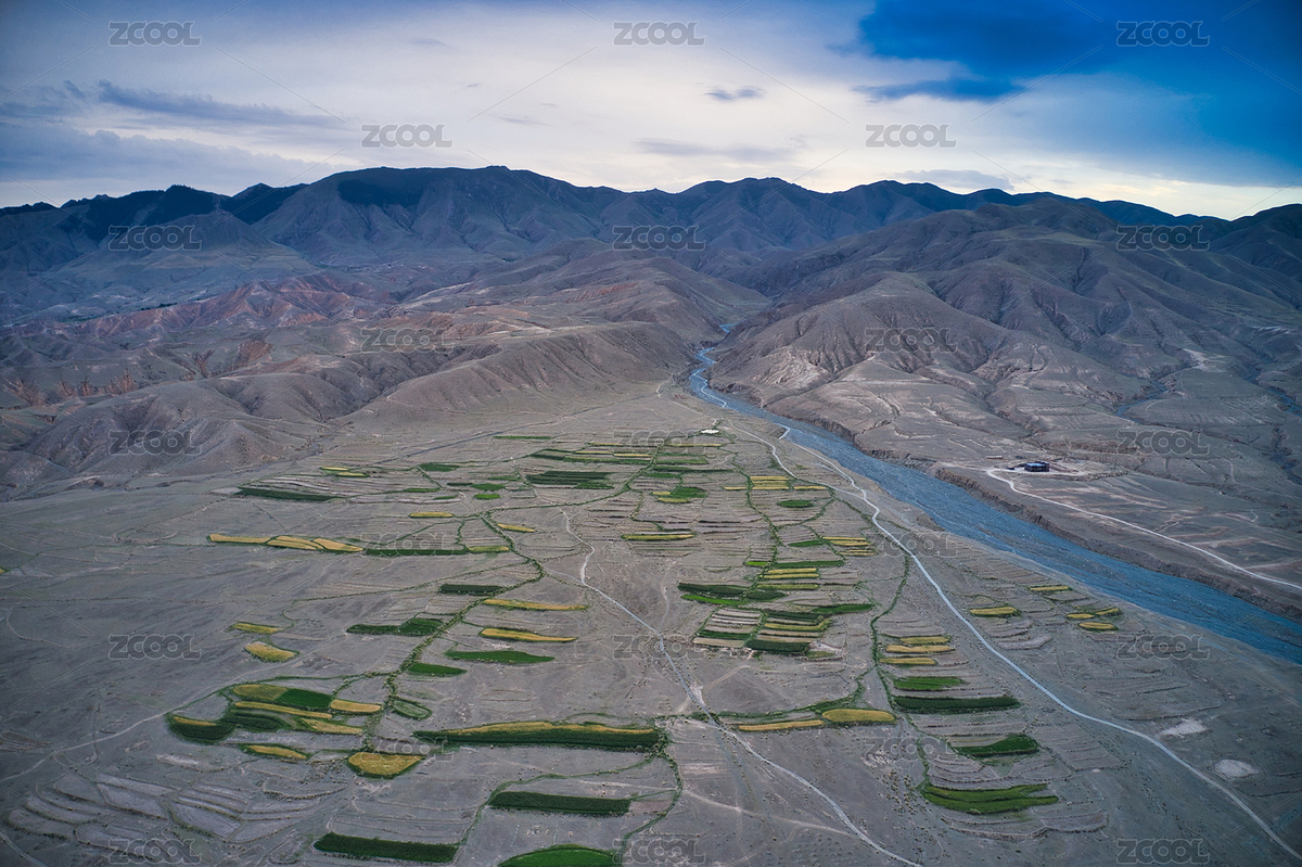 甘肃,祁连山,绿洲,傍晚,航拍,农田