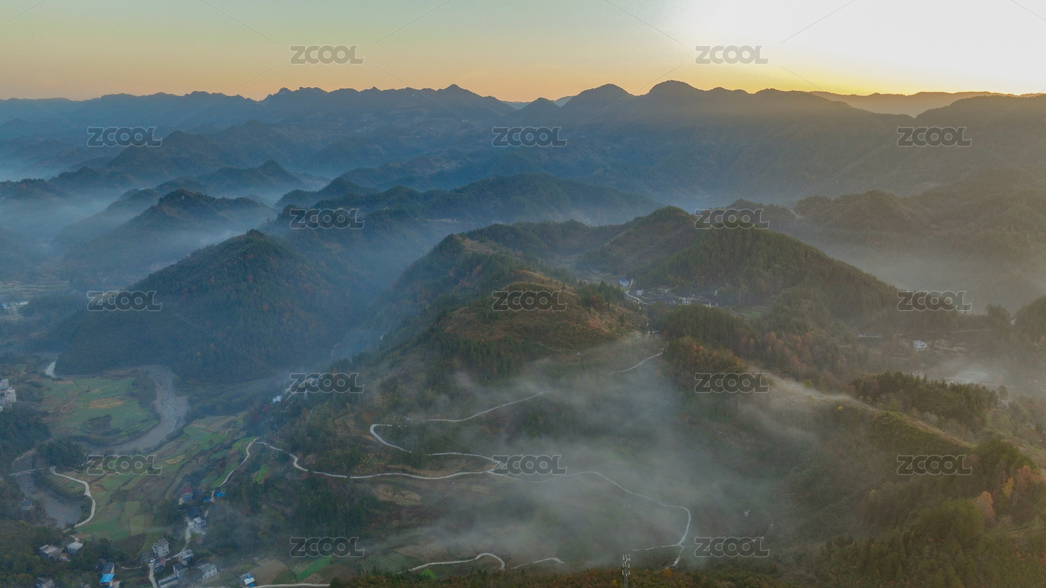 亚洲,中国,重庆,酉阳,山坡,村庄,雾,树木,山峰,睡佛
