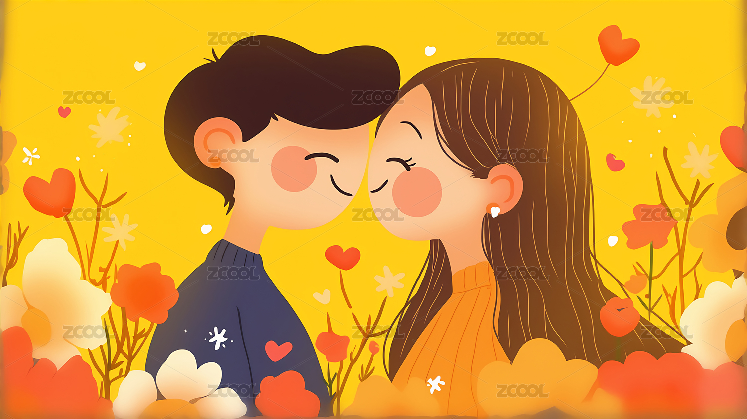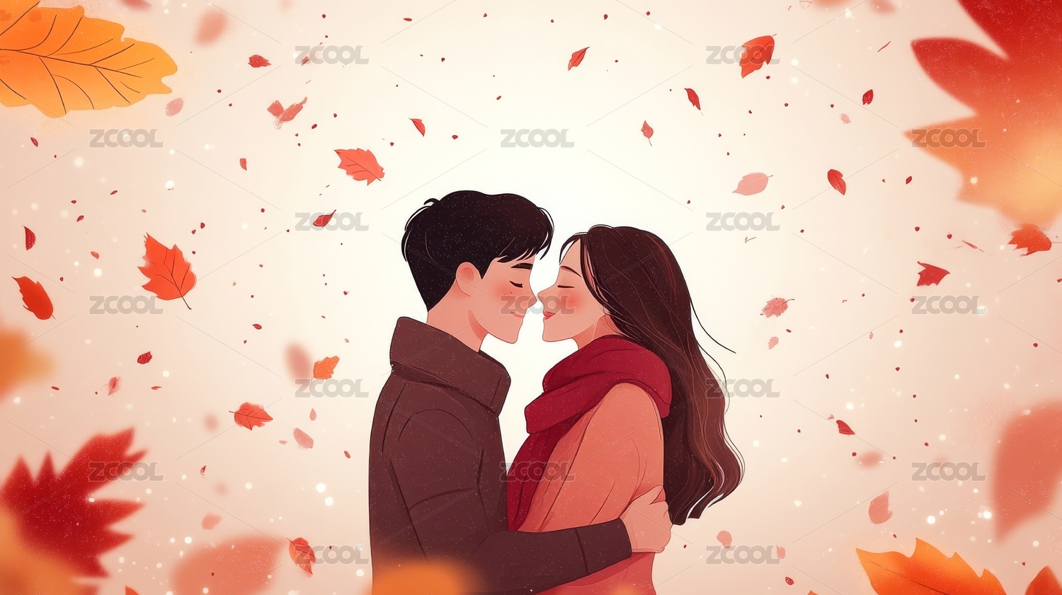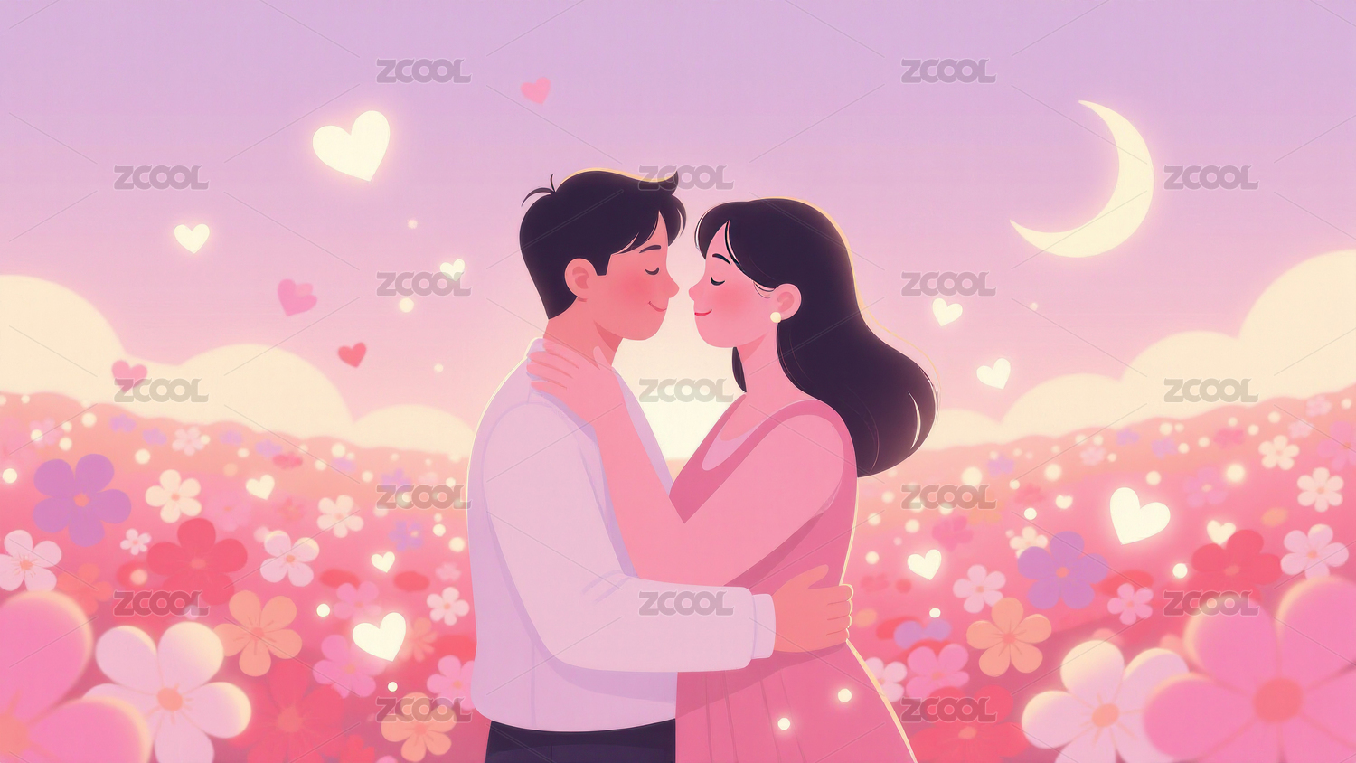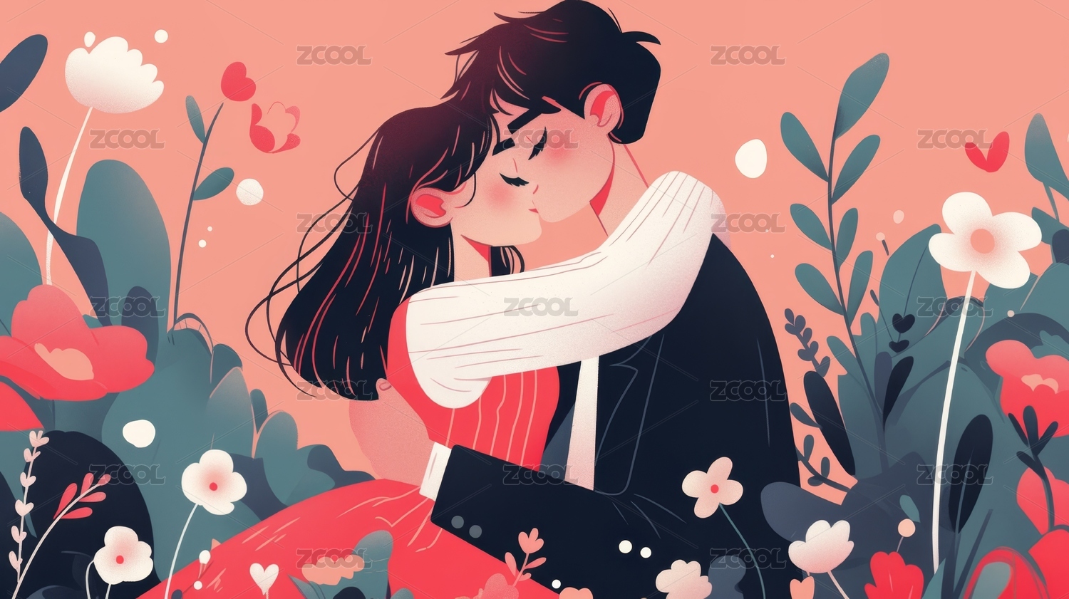 一幅温馨的插画,展现了一对情侣拥抱,背景