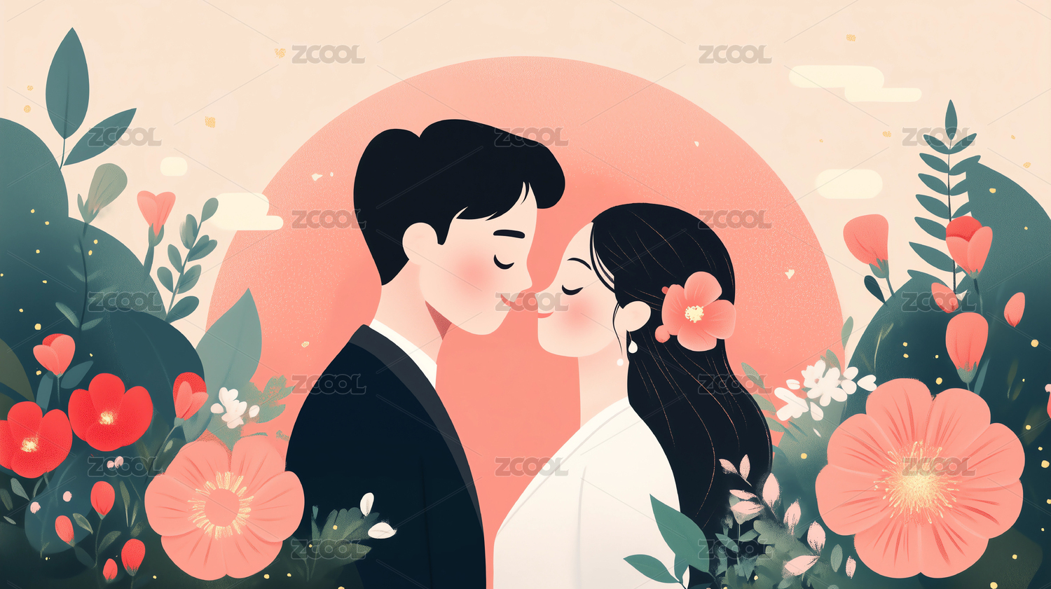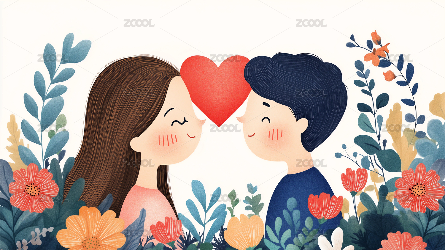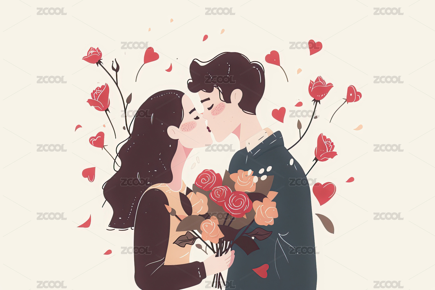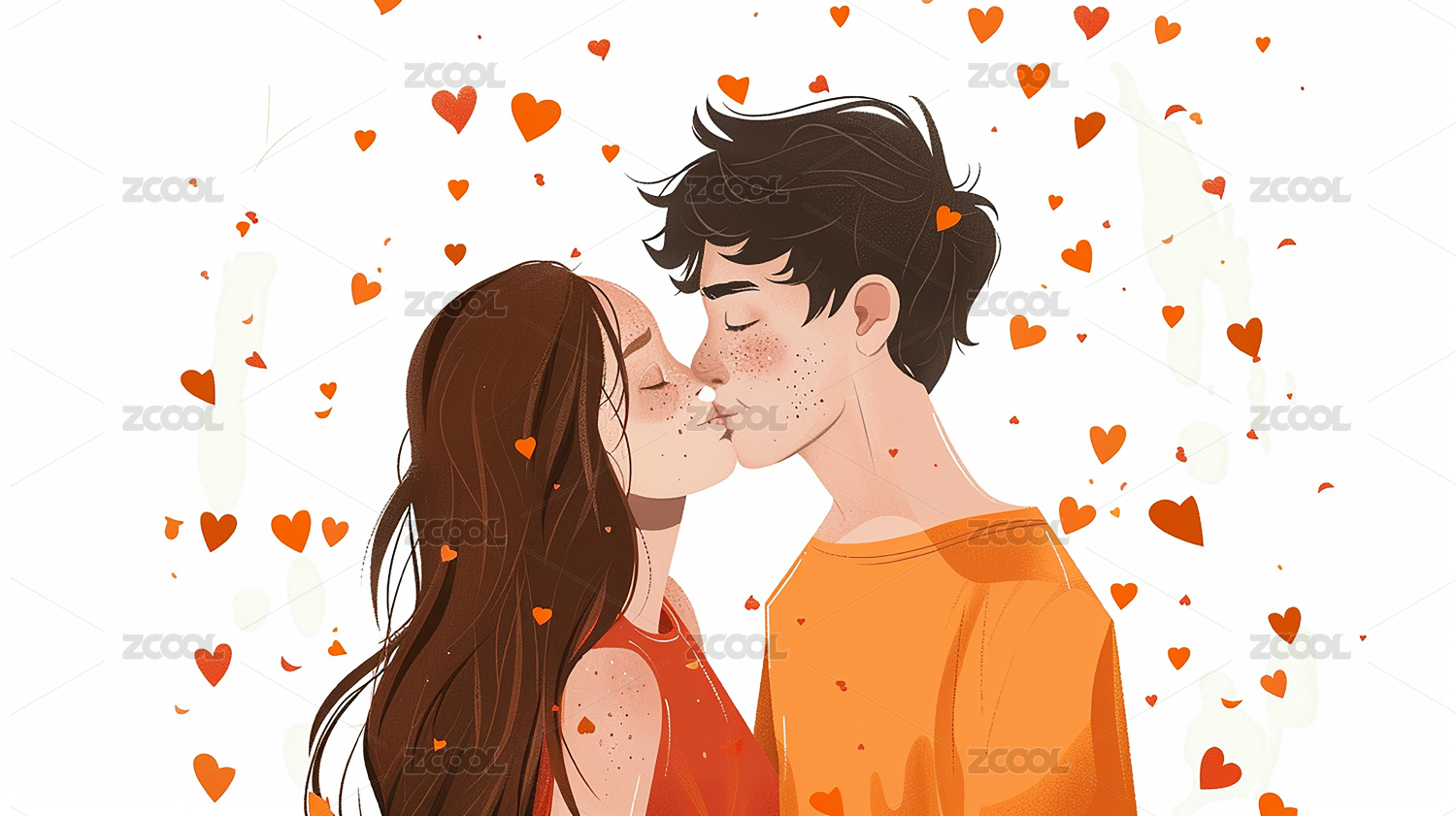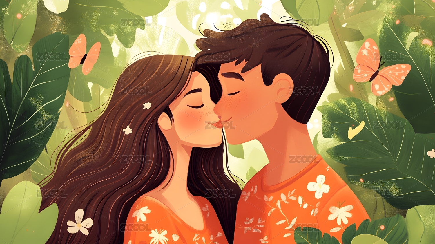 一幅温馨的插画,展现了一对情侣拥抱,背景