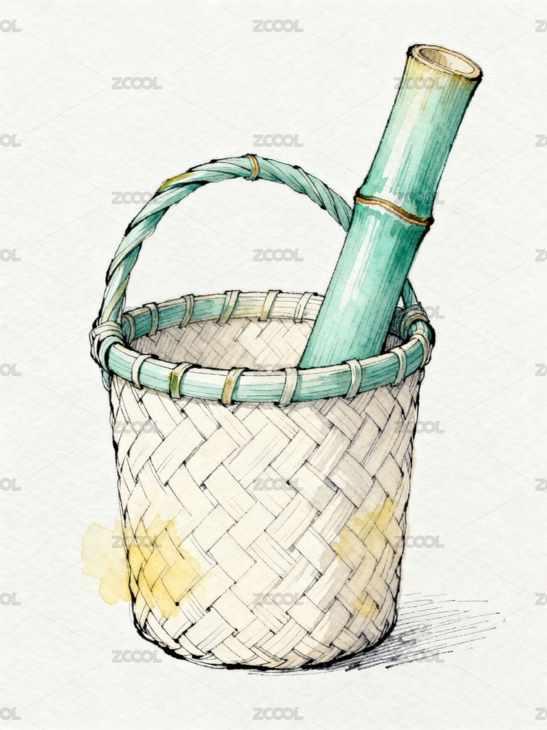 竹篮与竹筒的水彩画