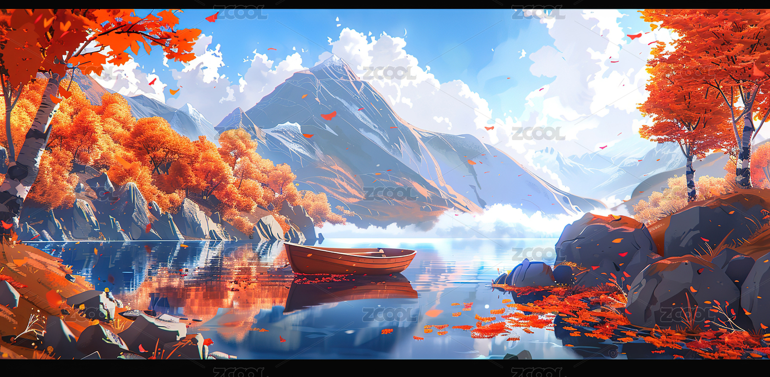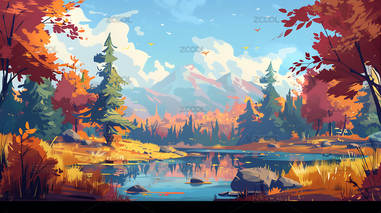 自然,户外,树,风景,高山,地形,水,插画,秋天,落叶