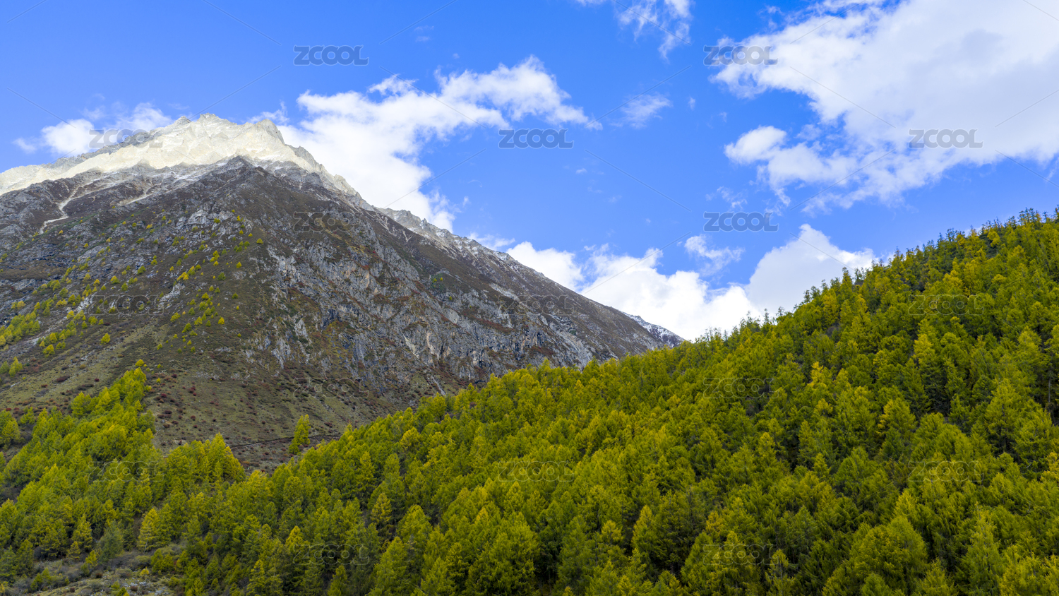 云南德钦蓝天白云雪山金黄色森林风景