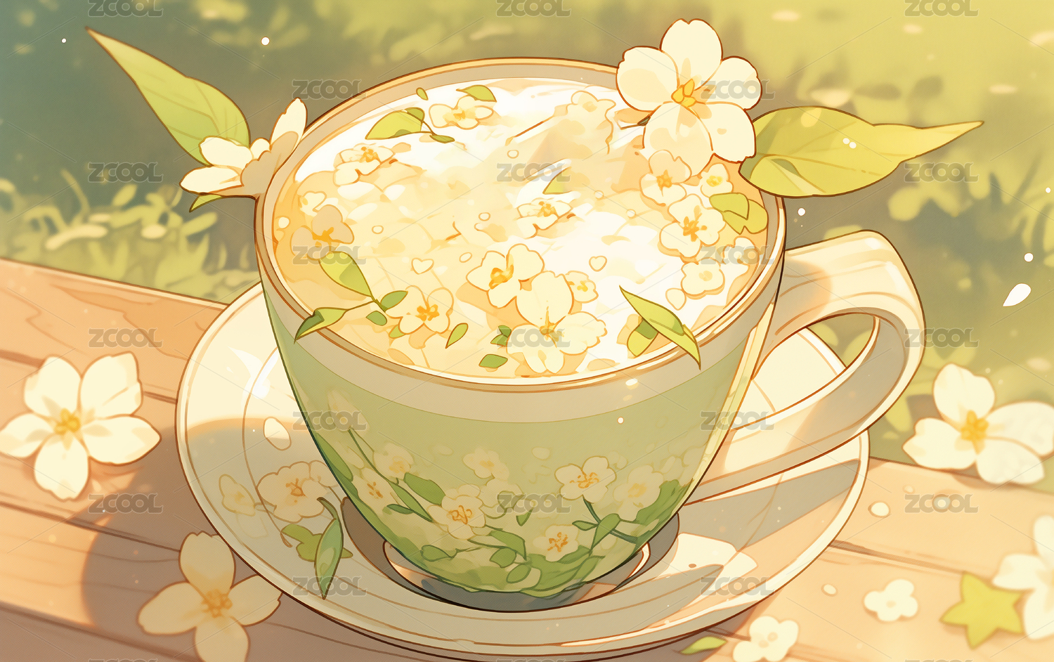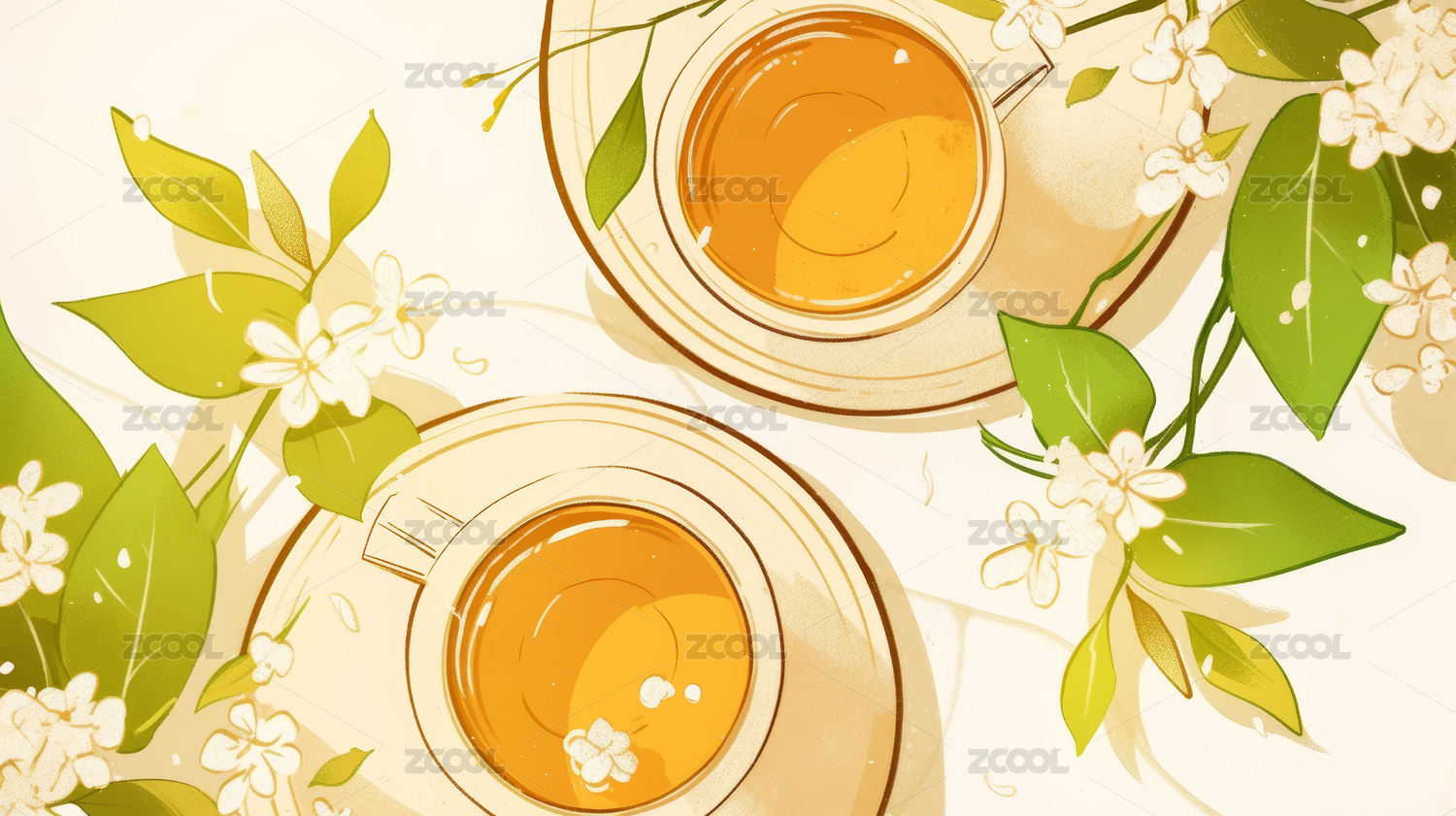 插画,传统,细节,花朵,黄色,自然,金色,透明,叶子,饮品