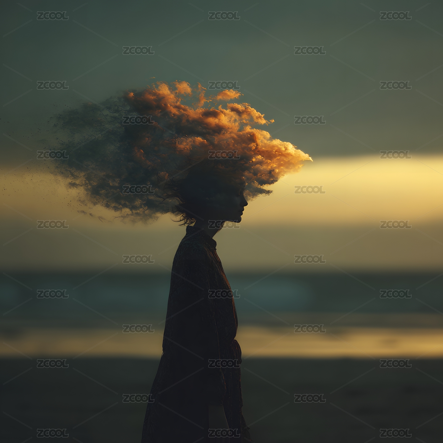 女性剪影头部烟雾形态立于海边黄昏
