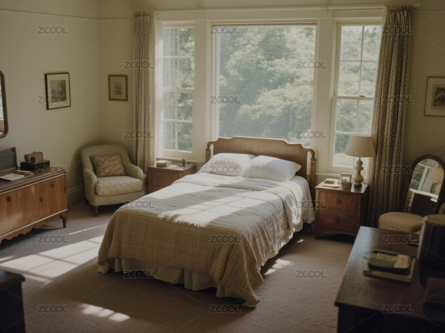 阳光洒落的温馨卧室场景摄影素材