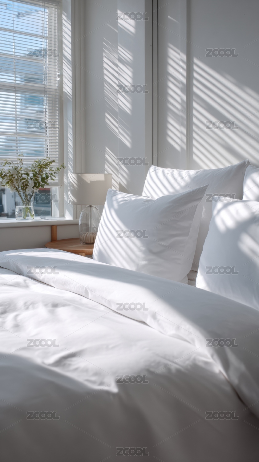 现代,白色,简约,阳光,窗户,窗帘,床单,枕头,整洁,明亮