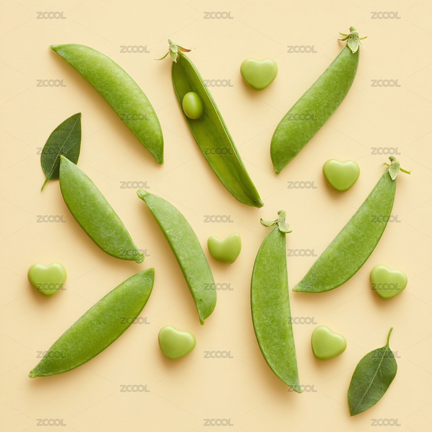 白底上放着一个完整豌豆荚和一个剥开麦豌豆