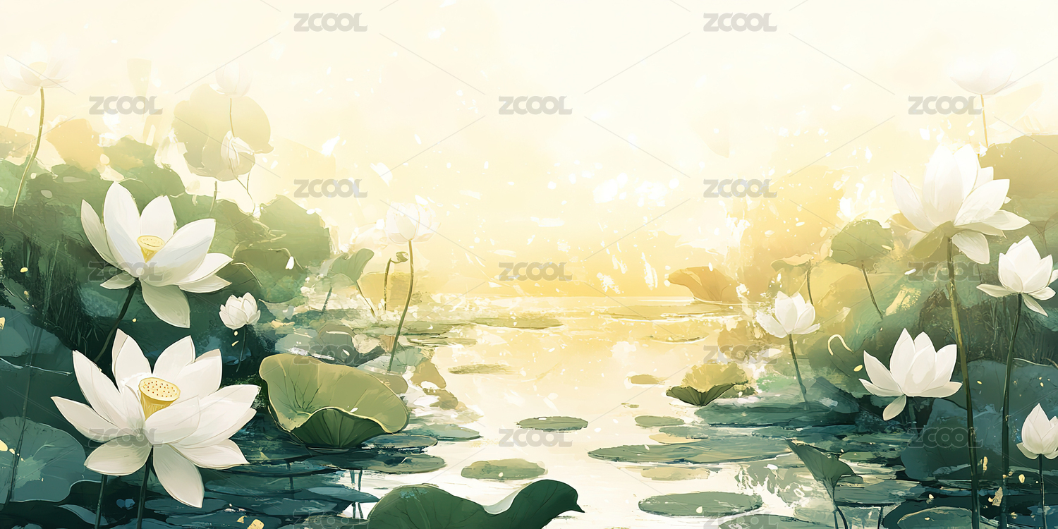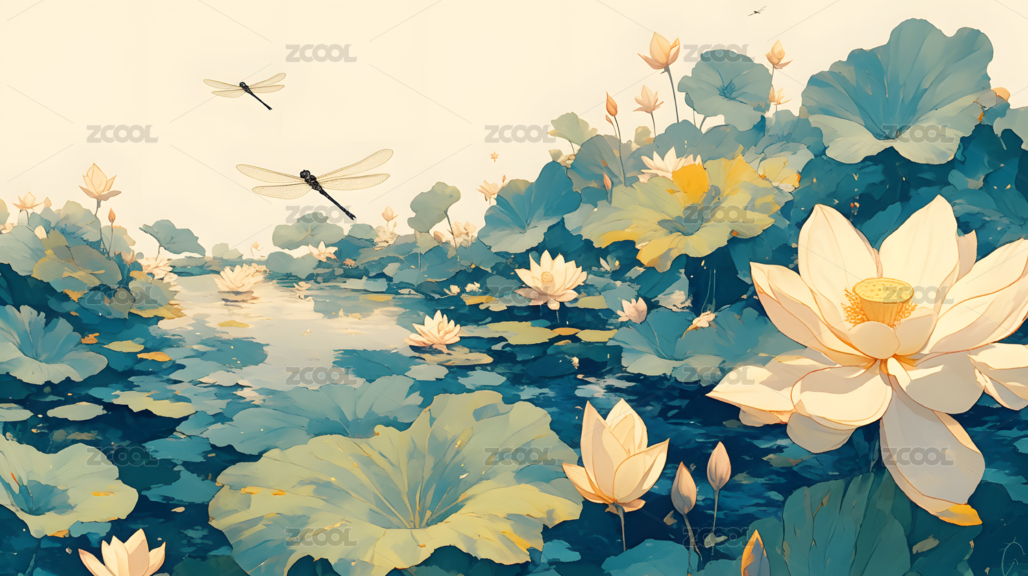 立夏节气国潮风景插画,夏天荷花池塘场景插