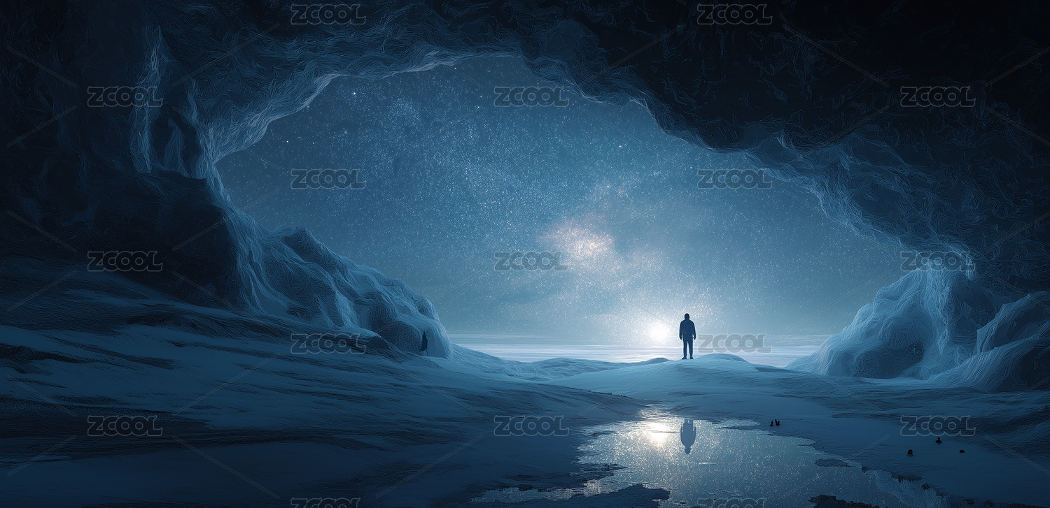 洞穴内人物观星空雪景科幻场景图