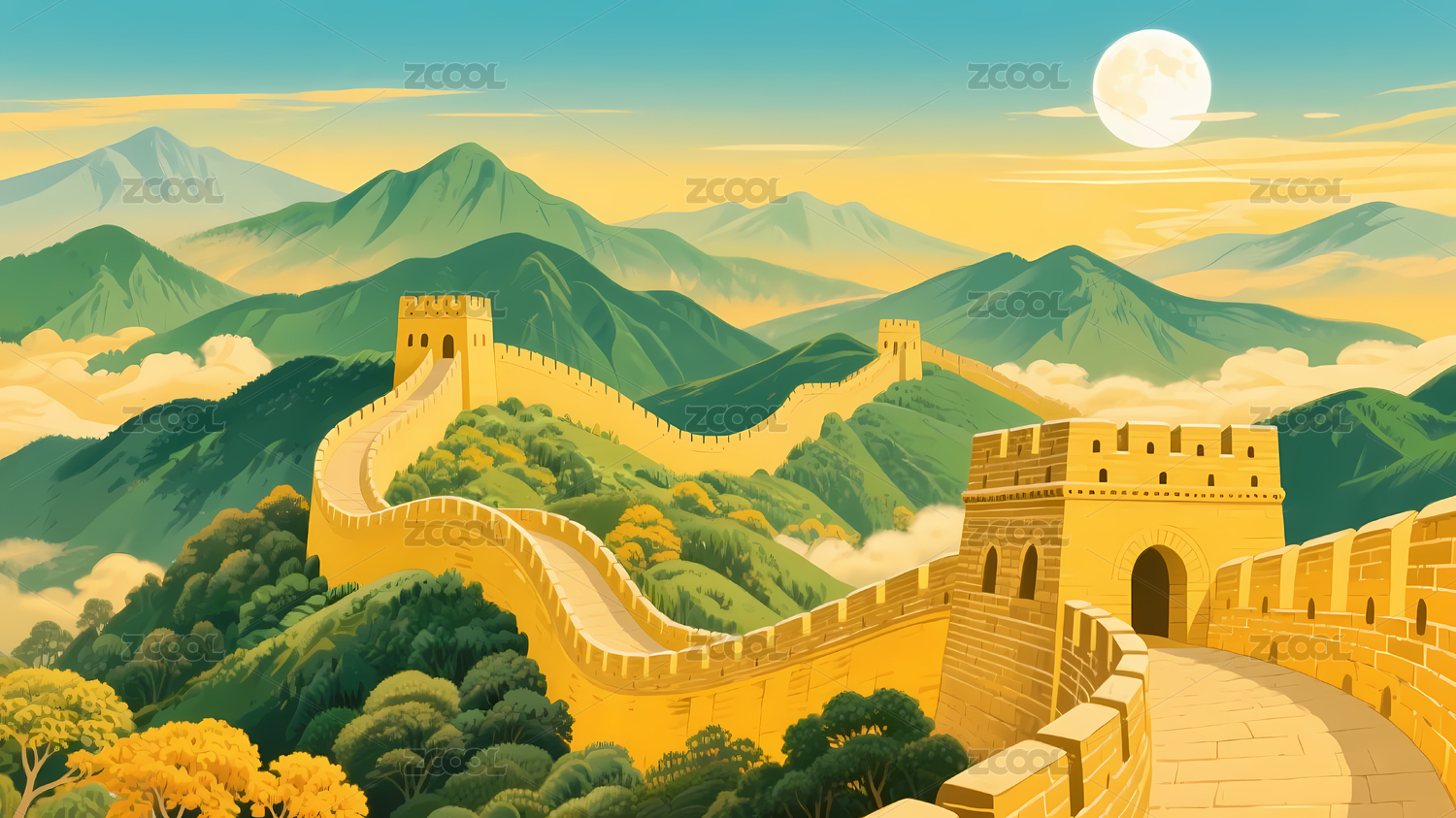 长城,秋天,好汉,云,山,树,插画,插图,绘本,国庆
