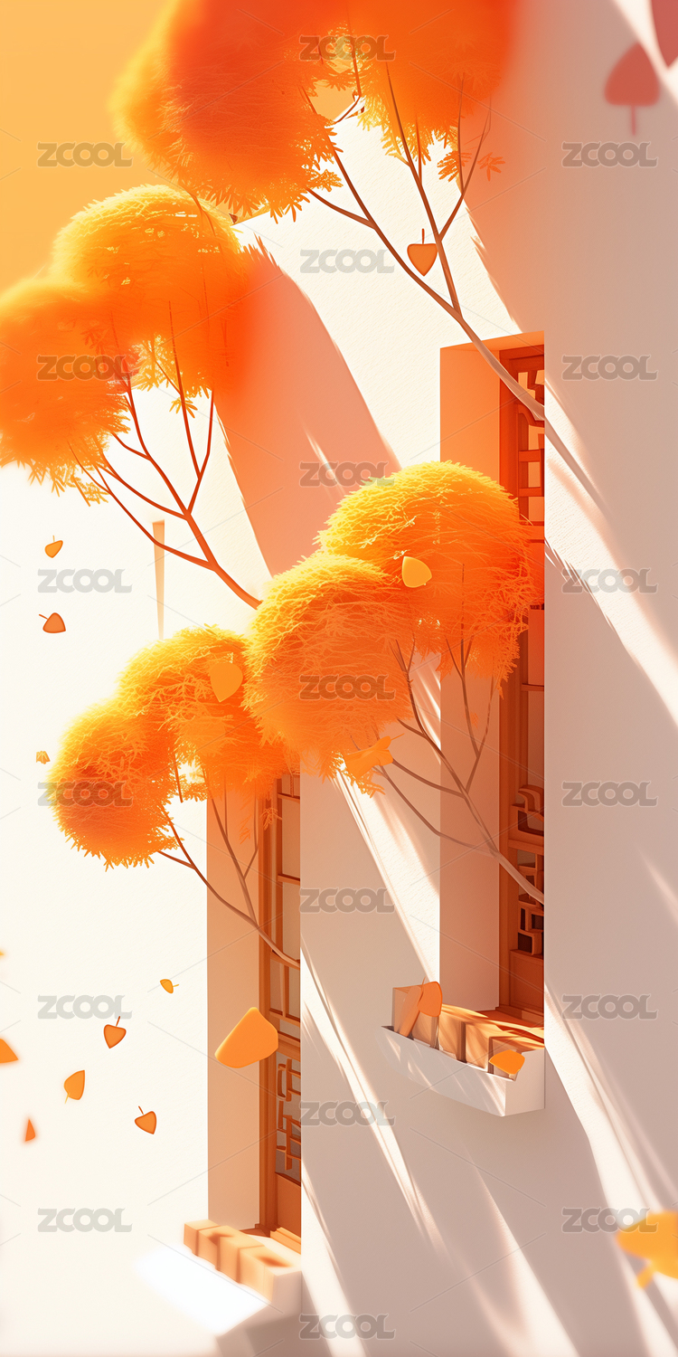 秋天晴朗天气窗外金黄色的枫树3D卡通插画