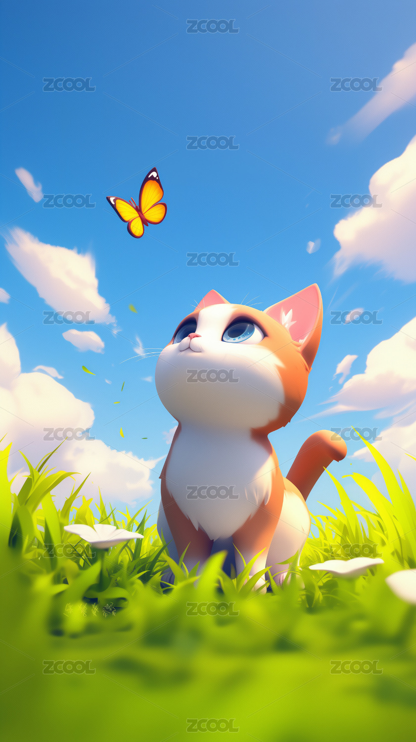 白天,晴天,绿色,原野,尖耳朵,猫,3D,立体,卡通,插画