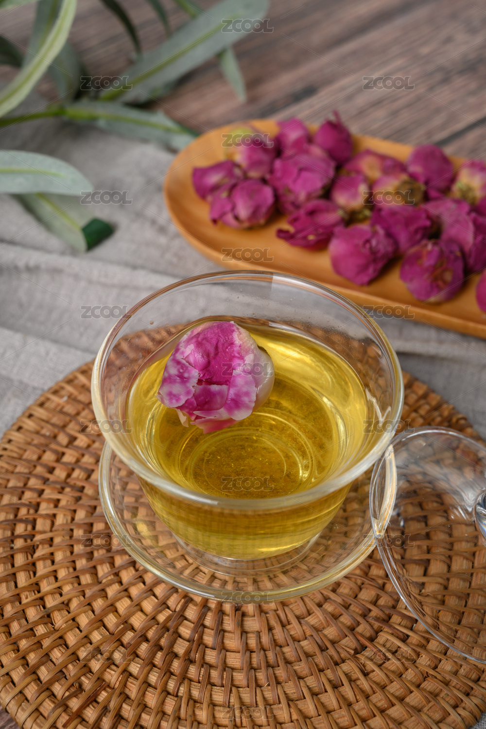 桌面上的杯子里的香甜可口的牡丹花苞茶
