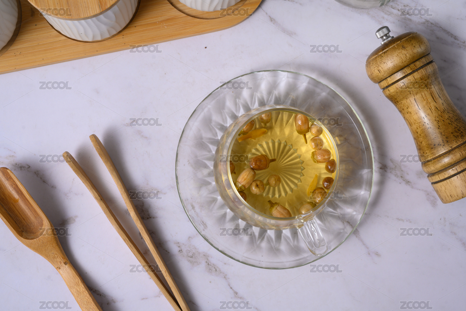 桌面上的杯子里的干爽清香的玳玳花茶