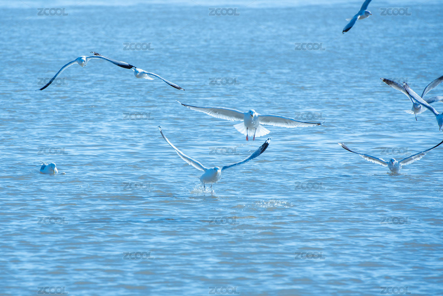 红嘴海鸥在水面上自由飞翔追逐觅食嬉戏