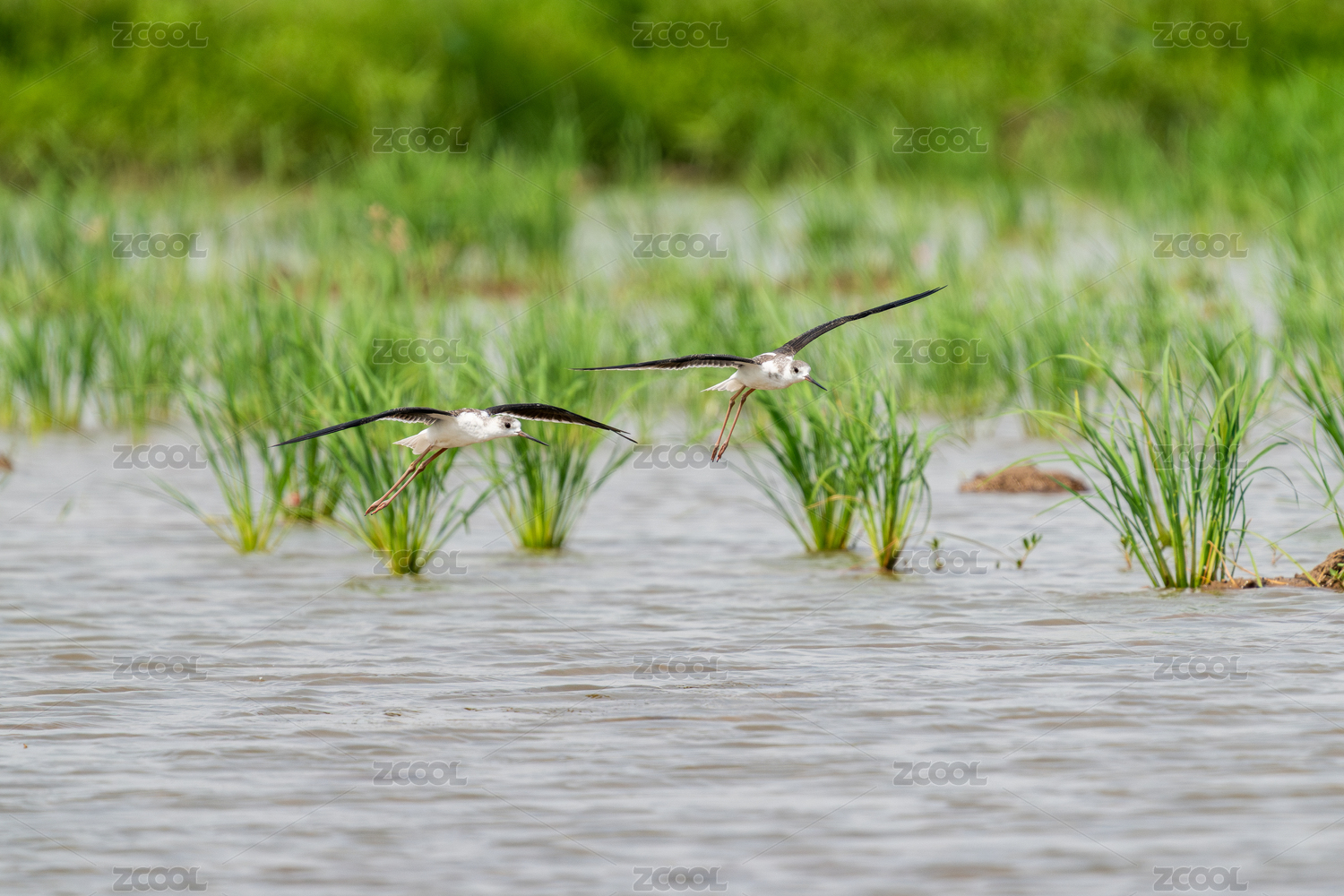 黑翅长脚鹬鸟在湿地中栖息觅食