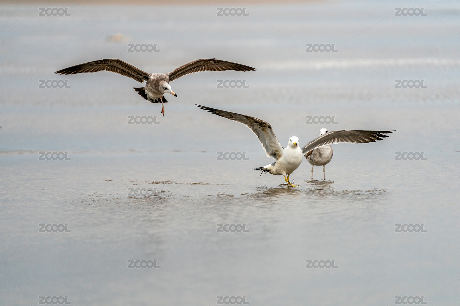 一群海鸥在海岸线沙滩上聚集休息及捕食