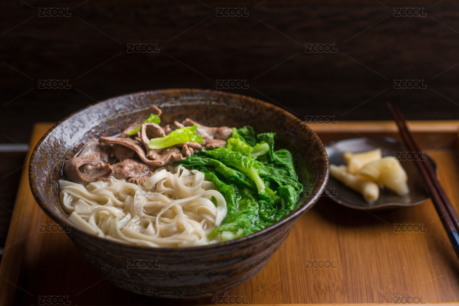 一碗排骨面摆放在木桌面上特写