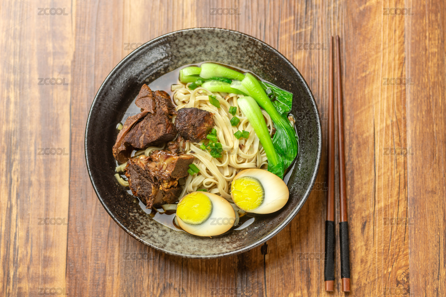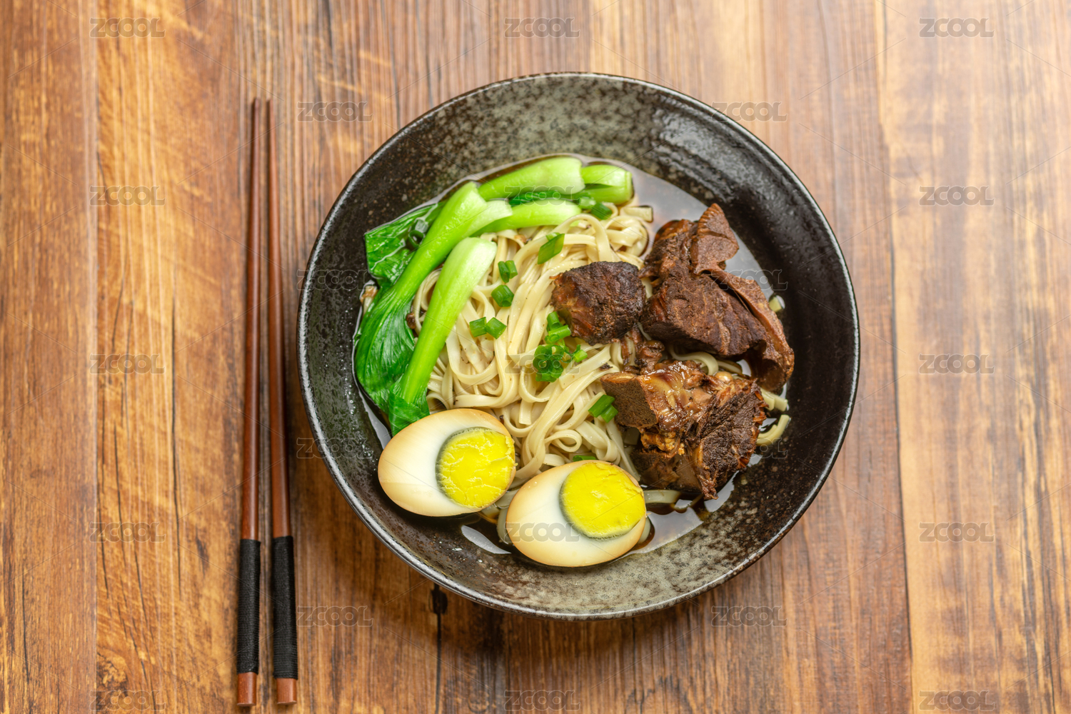 一碗排骨卤蛋面摆放在木桌面上