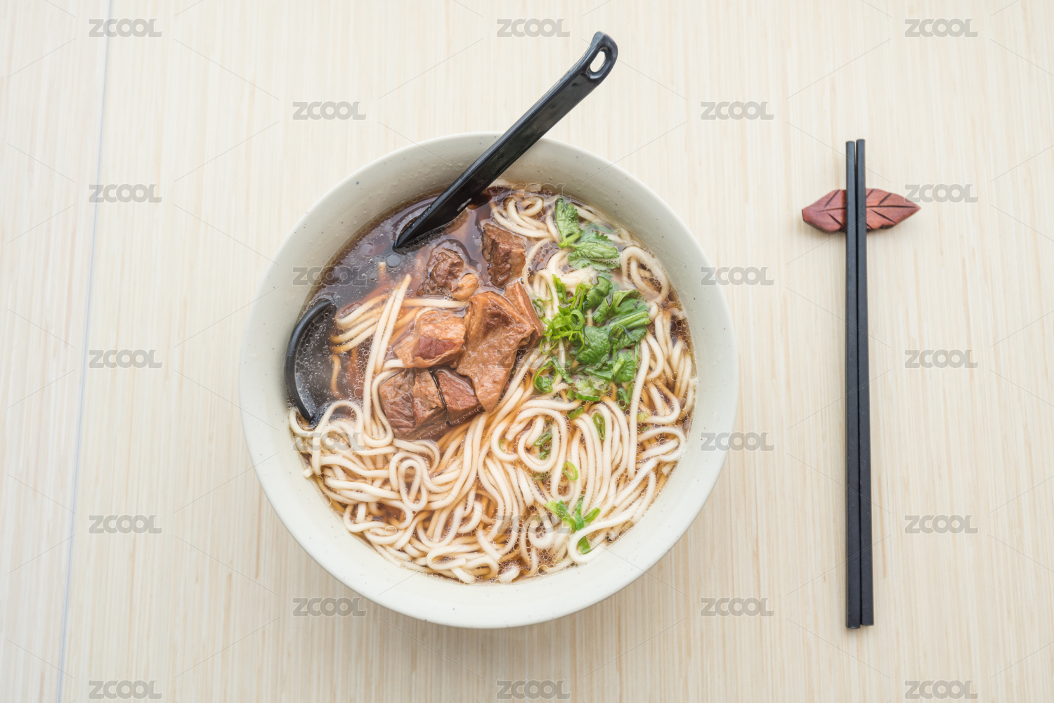 木纹桌面上的一碗红烧大骨牛肉面