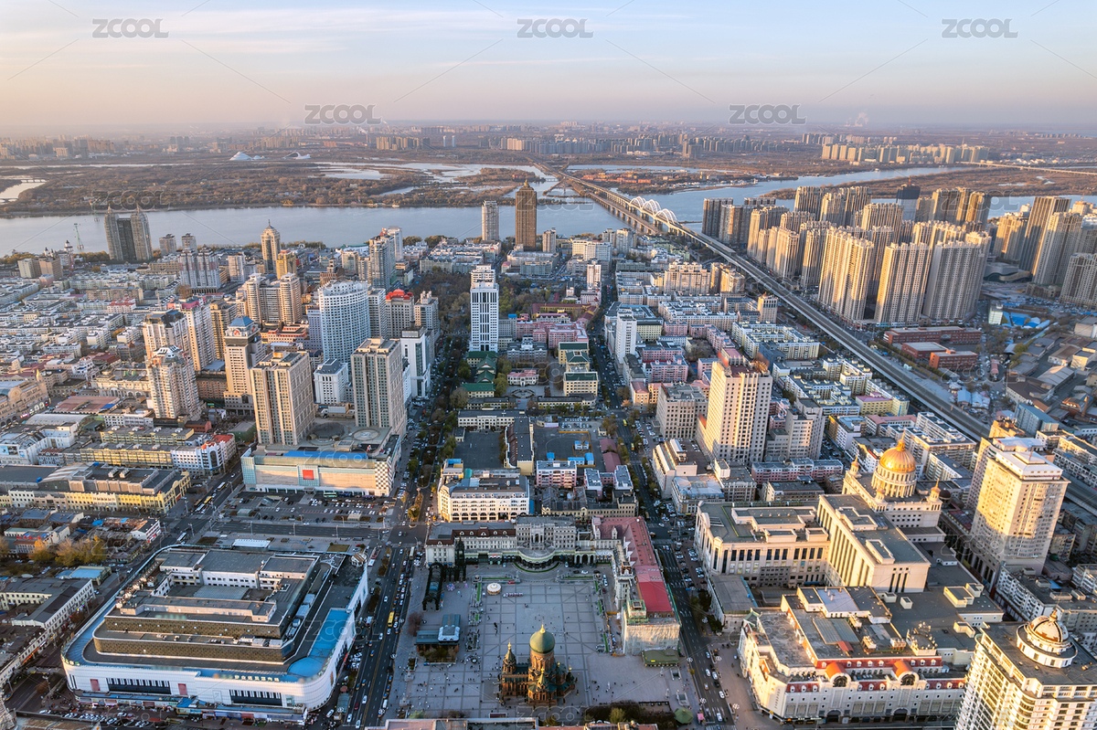 中国黑龙江省哈尔滨市中心航拍城市天际线