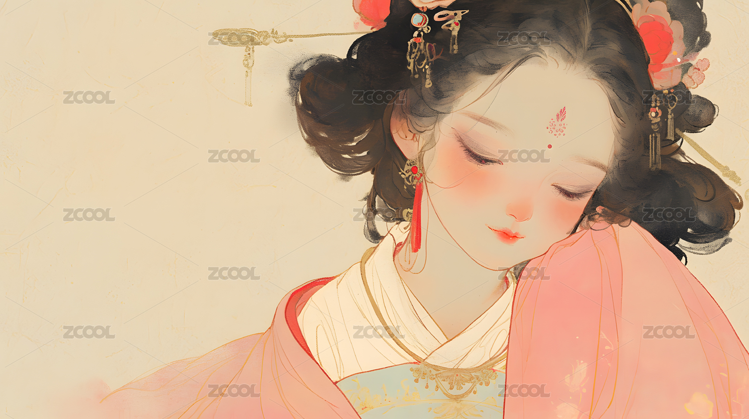 花,人物,古风,场景,水墨,女生,扇子,古筝,插画,少女