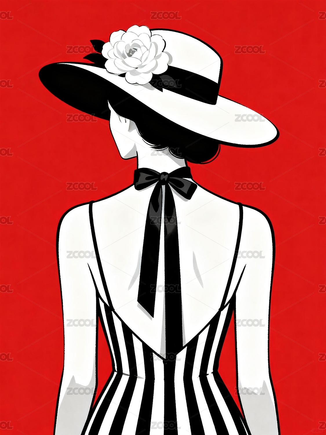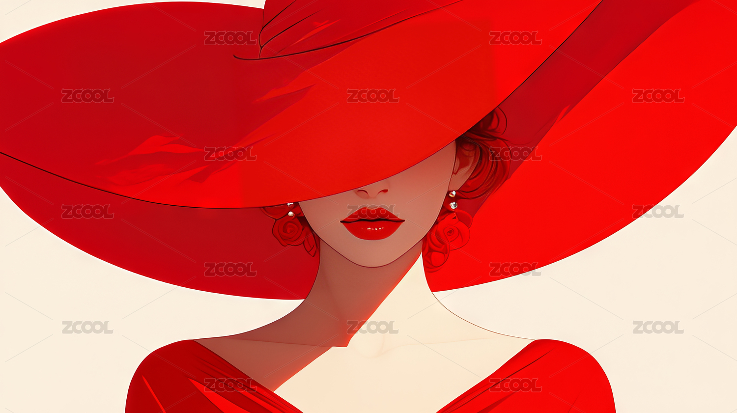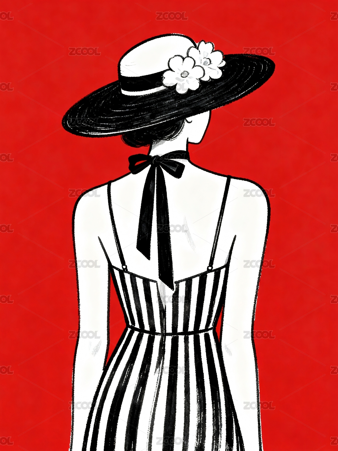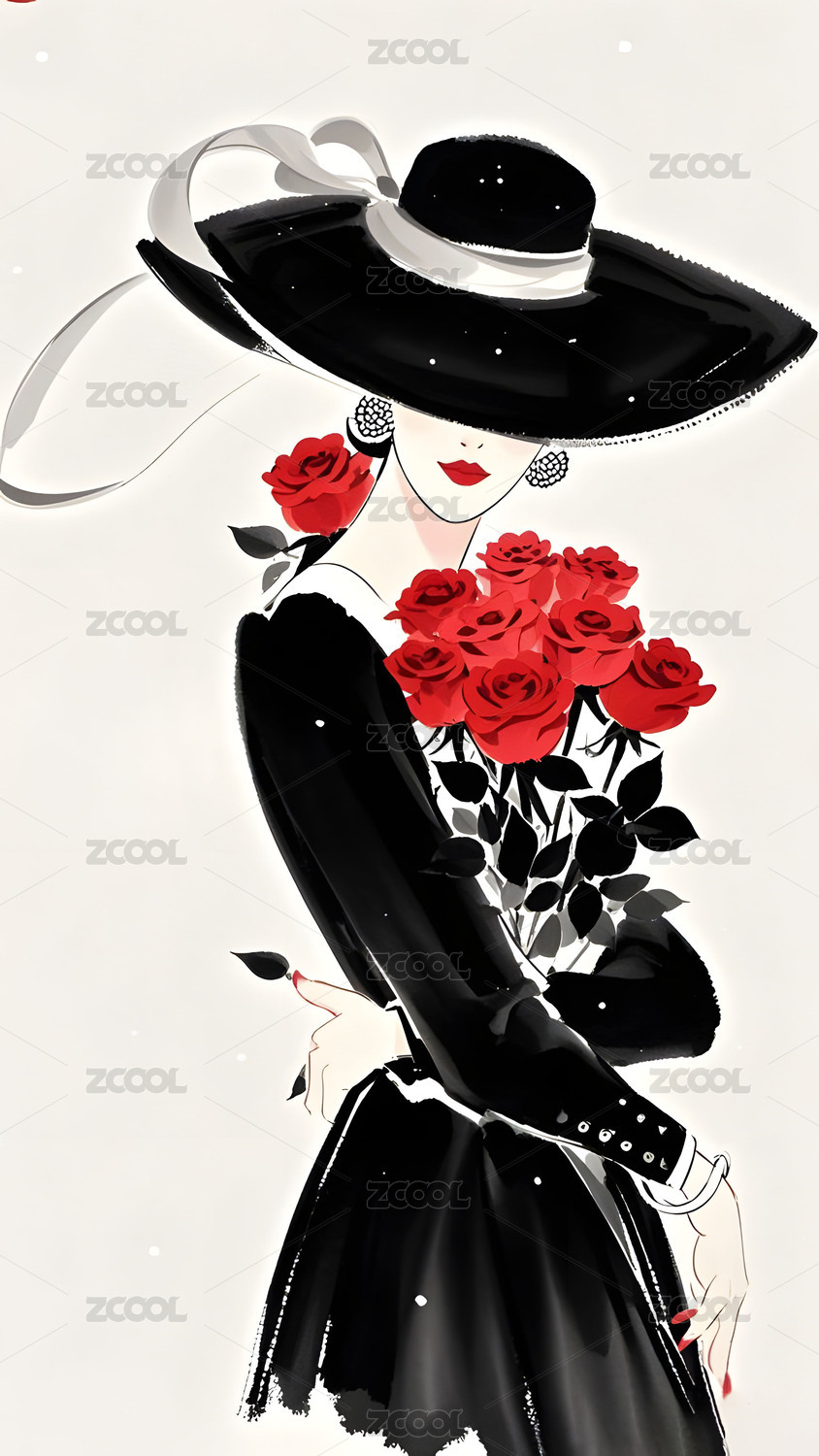 时尚,女性,优雅,红色连衣裙,白色帽子,鲜花,花束,红花,插画,线条画